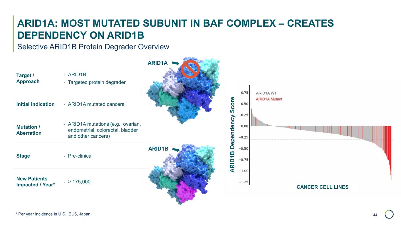 | ARID1A: MOST MUTATED SUBUNIT IN BAF COMPLEX – CREATES DEPENDENCY ON ARID1B Selective ARID1B Protein Degrader Overview * Per year incidence in U.S., EU5, Japan ARID1A ARID1B AR ID 1B D ep en de nc y Sc or e CANCER CELL LINES Target / Approach • ARID1B • Targeted protein degrader Initial Indication • ARID1A mutated cancers Mutation / Aberration • ARID1A mutations (e.g., ovarian, endometrial, colorectal, bladder and other cancers) Stage • Pre-clinical New Patients Impacted / Year* • > 175,000 44