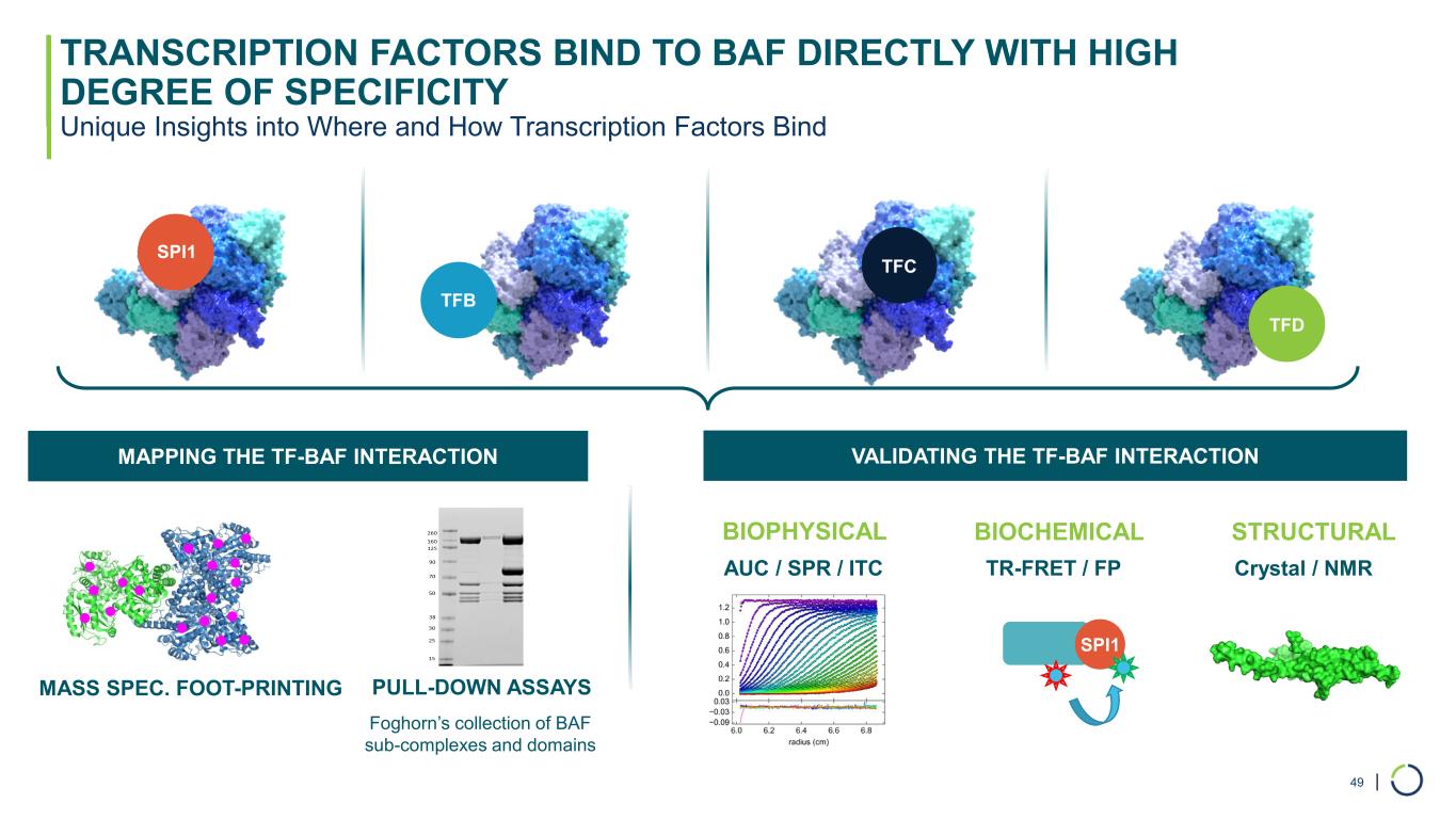 | TFS ARE COMPELLING DRUG TARGETS… …BUT HISTORICALLY DIFFICULT TO TARGET • Highly involved in gene expression • Implicated in range of cancers and other diseases • Featureless surface: no druggable binding pocket • Tight interactions with DNA: undruggable affinities A NEW APPROACH TO DRUGGING TRANSCRIPTION FACTORS Enabled by Proprietary Ability to Purify and Synthesize Chromatin Regulatory System Components HISTORICAL FOCUS POTENTIAL DRUGGABLE SITES FOGHORN’S FOCUS FOGHORN HAS A NEW APPROACH FOCUSING ON INTERACTION WITH BAF • Druggable binding pockets • Druggable affinities 48