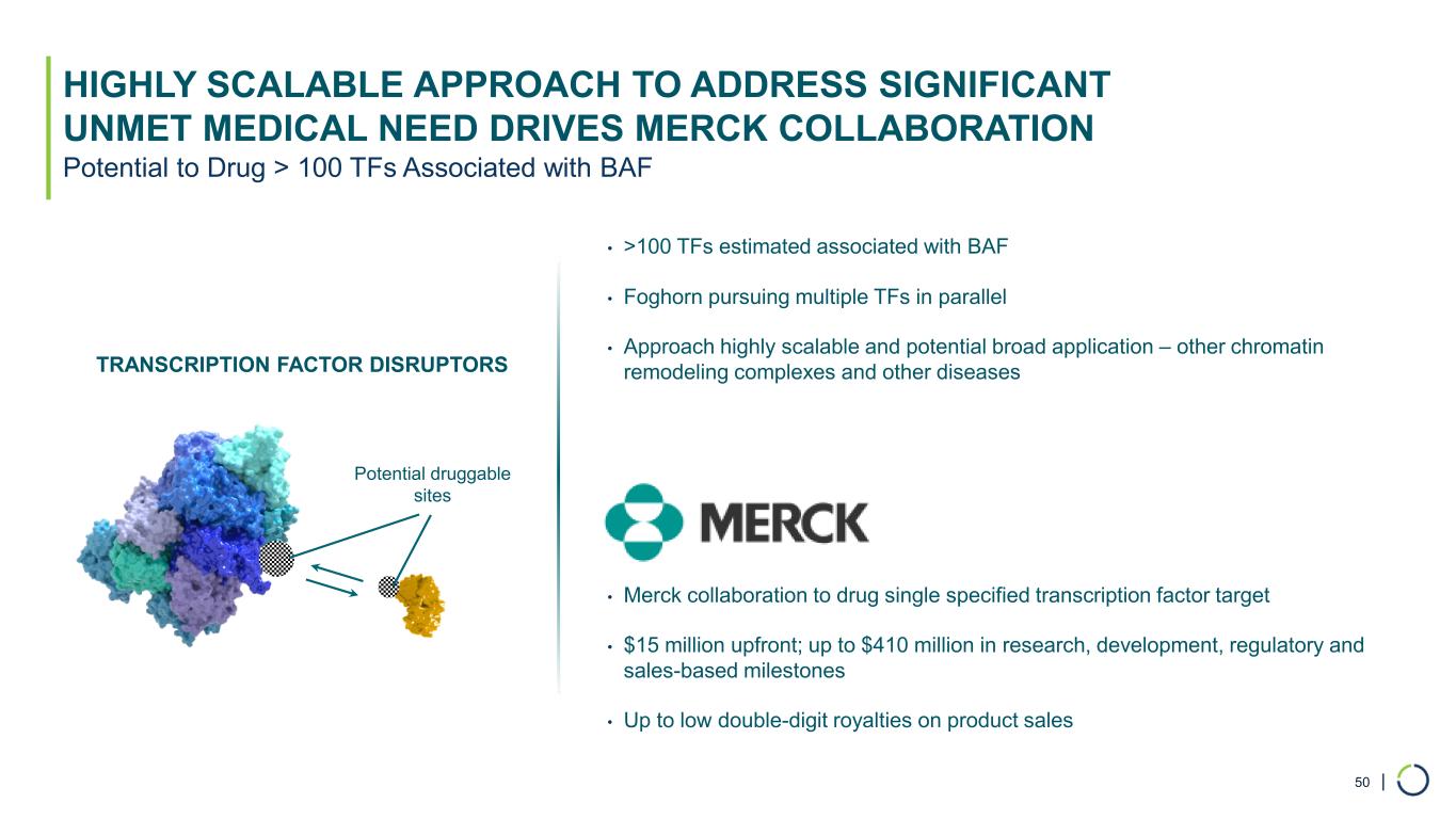 | • >100 TFs estimated associated with BAF • Foghorn pursuing multiple TFs in parallel • Approach highly scalable and potential broad application – other chromatin remodeling complexes and other diseases HIGHLY SCALABLE APPROACH TO ADDRESS SIGNIFICANT UNMET MEDICAL NEED DRIVES MERCK COLLABORATION Potential to Drug > 100 TFs Associated with BAF • Merck collaboration to drug single specified transcription factor target • $15 million upfront; up to $410 million in research, development, regulatory and sales-based milestones • Up to low double-digit royalties on product sales TRANSCRIPTION FACTOR DISRUPTORS Potential druggable sites 50