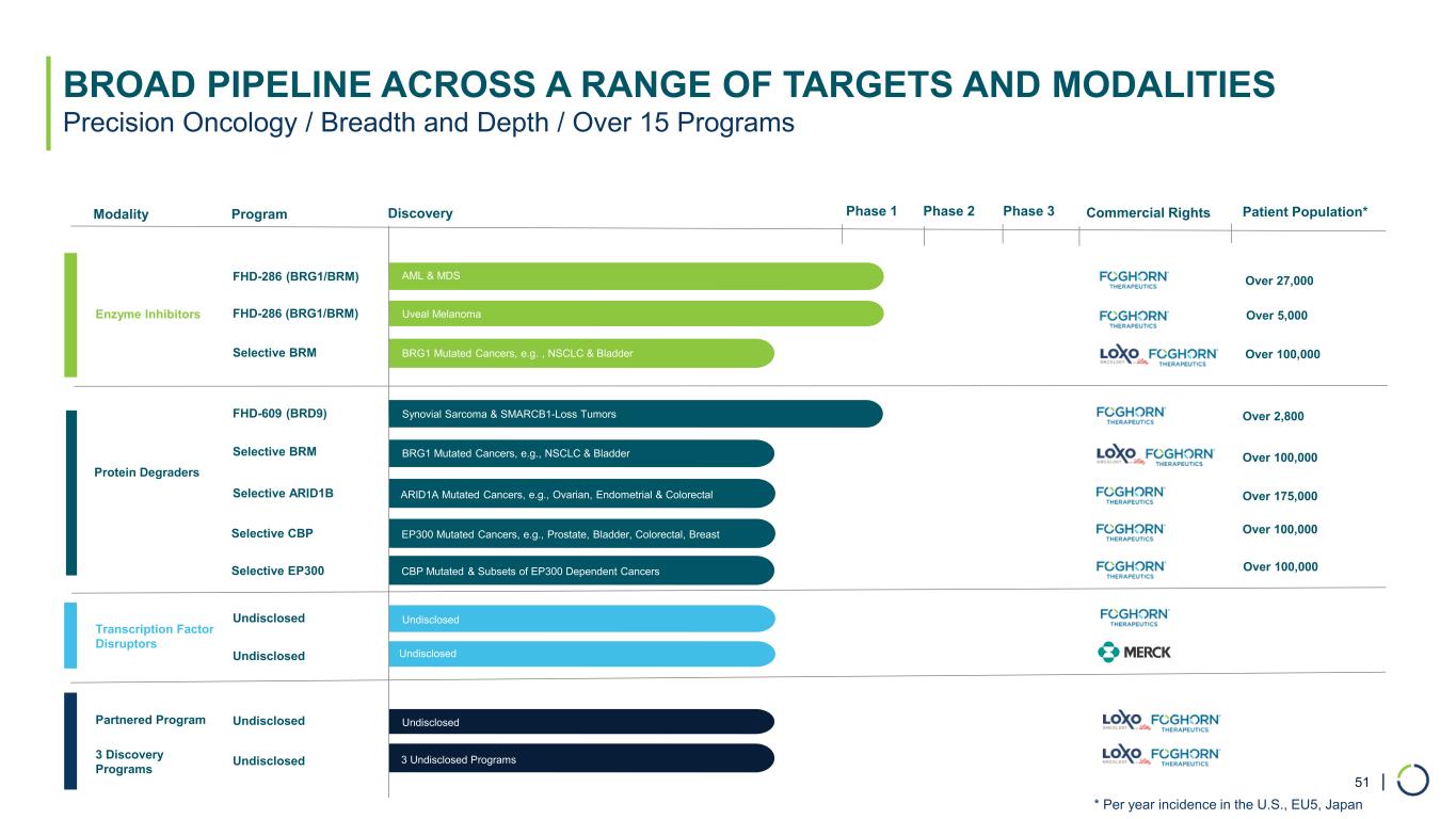 | Selective CBP BROAD PIPELINE ACROSS A RANGE OF TARGETS AND MODALITIES Modality Program Discovery Phase 1 Phase 2 Phase 3 Patient Population* Enzyme Inhibitors Transcription Factor Disruptors Partnered Program AML & MDS Uveal Melanoma BRG1 Mutated Cancers, e.g. , NSCLC & Bladder Undisclosed Undisclosed FHD-286 (BRG1/BRM) FHD-286 (BRG1/BRM) Selective BRM Undisclosed Undisclosed 3 Discovery Programs UndisclosedUndisclosed Undisclosed 3 Undisclosed Programs Precision Oncology / Breadth and Depth / Over 15 Programs Protein Degraders FHD-609 (BRD9) Selective BRM Selective ARID1B Synovial Sarcoma & SMARCB1-Loss Tumors BRG1 Mutated Cancers, e.g., NSCLC & Bladder ARID1A Mutated Cancers, e.g., Ovarian, Endometrial & Colorectal 51 Selective CBP EP300 Mutated Cancers, e.g., Prostate, Bladder, Colorectal, Breast Commercial Rights Over 27,000 Over 5,000 Over 100,000 Over 100,000 Over 2,800 Over 175,000 Over 100,000 * Per year incidence in the U.S., EU5, Japan CBP Mutated & Subsets of EP300 Dependent Cancers Over 100,000EP300