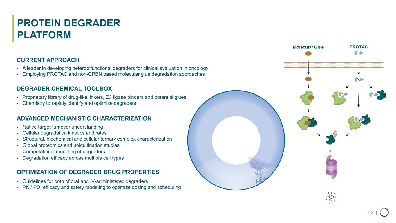 | CURRENT APPROACH OPTIMIZATION OF DEGRADER DRUG PROPERTIES DEGRADER CHEMICAL TOOLBOX • A leader in developing heterobifunctional degraders for clinical evaluation in oncology • Employing PROTAC and non-CRBN based molecular glue degradation approaches • Guidelines for both of oral and IV-administered degraders • PK / PD, efficacy and safety modeling to optimize dosing and scheduling • Proprietary library of drug-like linkers, E3 ligase binders and potential glues • Chemistry to rapidly identify and optimize degraders PROTEIN DEGRADER PLATFORM ADVANCED MECHANISTIC CHARACTERIZATION • Native target turnover understanding • Cellular degradation kinetics and rates • Structural, biochemical and cellular ternary complex characterization • Global proteomics and ubiquitination studies • Computational modeling of degraders • Degradation efficacy across multiple cell types Molecular Glue PROTAC 62