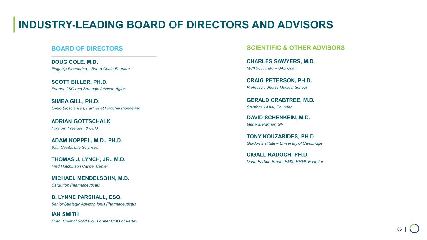| INDUSTRY-LEADING BOARD OF DIRECTORS AND ADVISORS DOUG COLE, M.D. Flagship Pioneering – Board Chair; Founder BOARD OF DIRECTORS SCOTT BILLER, PH.D. Former CSO and Strategic Advisor, Agios SIMBA GILL, PH.D. Evelo Biosciences, Partner at Flagship Pioneering ADRIAN GOTTSCHALK Foghorn President & CEO CIGALL KADOCH, PH.D. Dana-Farber, Broad, HMS, HHMI; Founder ADAM KOPPEL, M.D., PH.D. Bain Capital Life Sciences MICHAEL MENDELSOHN, M.D. Cardurion Pharmaceuticals IAN SMITH Exec. Chair of Solid Bio., Former COO of Vertex CHARLES SAWYERS, M.D. MSKCC, HHMI – SAB Chair SCIENTIFIC & OTHER ADVISORS CRAIG PETERSON, PH.D. Professor, UMass Medical School GERALD CRABTREE, M.D. Stanford, HHMI; Founder DAVID SCHENKEIN, M.D. General Partner, GV TONY KOUZARIDES, PH.D. Gurdon Institute – University of Cambridge 65 B. LYNNE PARSHALL, ESQ. Senior Strategic Advisor, Ionis Pharmaceuticals THOMAS J. LYNCH, JR., M.D. Fred Hutchinson Cancer Center