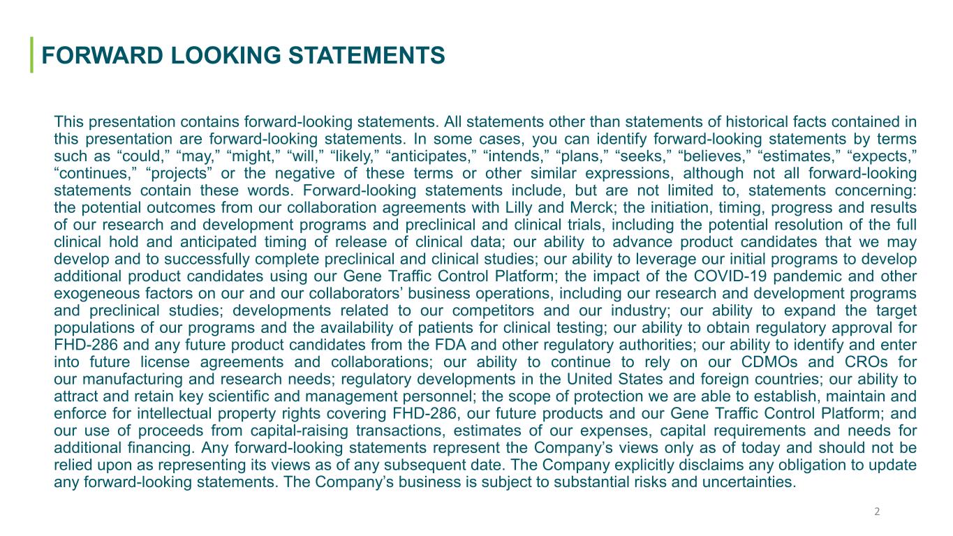 This presentation contains forward-looking statements. All statements other than statements of historical facts contained in this presentation are forward-looking statements. In some cases, you can identify forward-looking statements by terms such as “could,” “may,” “might,” “will,” “likely,” “anticipates,” “intends,” “plans,” “seeks,” “believes,” “estimates,” “expects,” “continues,” “projects” or the negative of these terms or other similar expressions, although not all forward-looking statements contain these words. Forward-looking statements include, but are not limited to, statements concerning: the potential outcomes from our collaboration agreements with Lilly and Merck; the initiation, timing, progress and results of our research and development programs and preclinical and clinical trials, including the potential resolution of the full clinical hold and anticipated timing of release of clinical data; our ability to advance product candidates that we may develop and to successfully complete preclinical and clinical studies; our ability to leverage our initial programs to develop additional product candidates using our Gene Traffic Control Platform; the impact of the COVID-19 pandemic and other exogeneous factors on our and our collaborators’ business operations, including our research and development programs and preclinical studies; developments related to our competitors and our industry; our ability to expand the target populations of our programs and the availability of patients for clinical testing; our ability to obtain regulatory approval for FHD-286 and any future product candidates from the FDA and other regulatory authorities; our ability to identify and enter into future license agreements and collaborations; our ability to continue to rely on our CDMOs and CROs for our manufacturing and research needs; regulatory developments in the United States and foreign countries; our ability to attract and retain key scientific and management personnel; the scope of protection we are able to establish, maintain and enforce for intellectual property rights covering FHD-286, our future products and our Gene Traffic Control Platform; and our use of proceeds from capital-raising transactions, estimates of our expenses, capital requirements and needs for additional financing. Any forward-looking statements represent the Company’s views only as of today and should not be relied upon as representing its views as of any subsequent date. The Company explicitly disclaims any obligation to update any forward-looking statements. The Company’s business is subject to substantial risks and uncertainties. Forward-Looking StatementsFORWARD LOOKING STATEMENTS 2