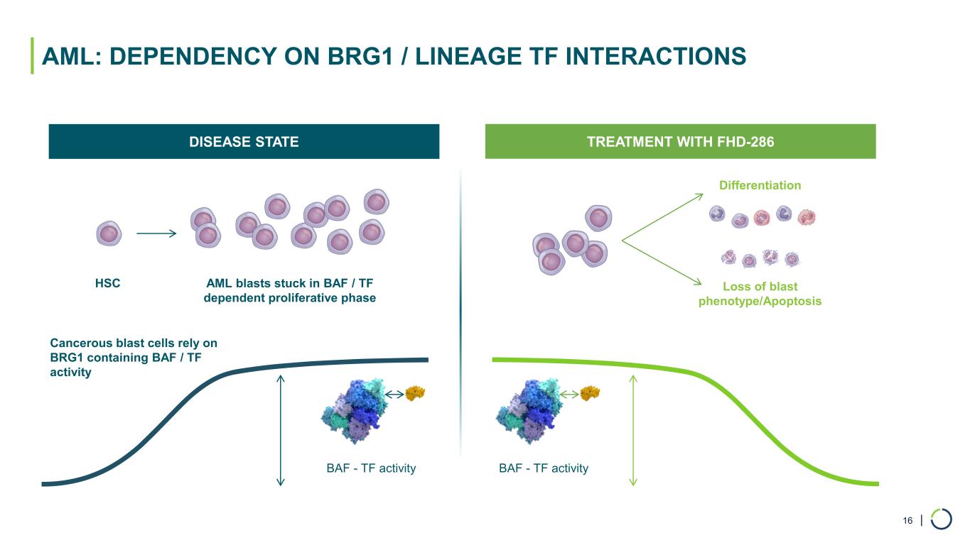 | AML: DEPENDENCY ON BRG1 / LINEAGE TF INTERACTIONS HSC AML blasts stuck in BAF / TF dependent proliferative phase Loss of blast phenotype/Apoptosis Differentiation Cancerous blast cells rely on BRG1 containing BAF / TF activity BAF - TF activity BAF - TF activity DISEASE STATE TREATMENT WITH FHD-286 16
