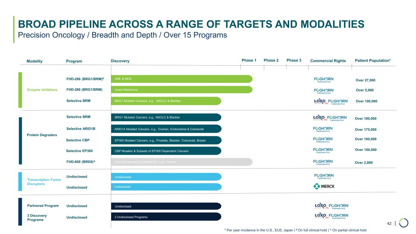 | • >100 TFs estimated associated with BAF • Foghorn pursuing multiple TFs in parallel • Approach highly scalable and potential broad application – other chromatin remodeling complexes and other diseases HIGHLY SCALABLE APPROACH TO ADDRESS SIGNIFICANT UNMET MEDICAL NEED DRIVES MERCK COLLABORATION Potential to Drug > 100 TFs Associated with BAF • Merck collaboration to drug single specified transcription factor target • $15 million upfront; up to $410 million in research, development, regulatory and sales-based milestones • Up to low double-digit royalties on product sales TRANSCRIPTION FACTOR DISRUPTORS Potential druggable sites 41