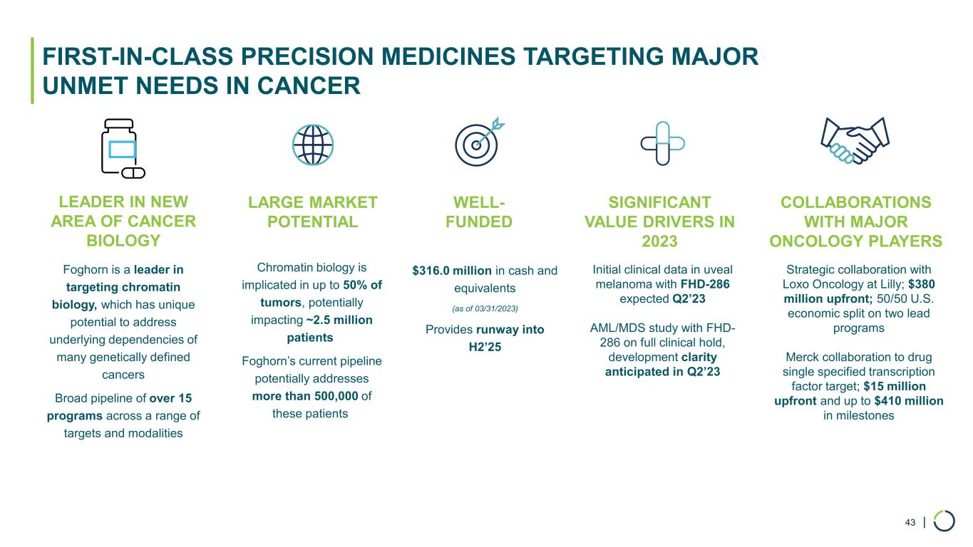 | Selective CBP BROAD PIPELINE ACROSS A RANGE OF TARGETS AND MODALITIES Modality Program Discovery Phase 1 Phase 2 Phase 3 Patient Population* Enzyme Inhibitors Transcription Factor Disruptors Partnered Program AML & MDS Uveal Melanoma BRG1 Mutated Cancers, e.g. , NSCLC & Bladder Undisclosed Undisclosed FHD-286 (BRG1/BRM)# FHD-286 (BRG1/BRM) Selective BRM Undisclosed Undisclosed 3 Discovery Programs UndisclosedUndisclosed Undisclosed 3 Undisclosed Programs Precision Oncology / Breadth and Depth / Over 15 Programs Protein Degraders Selective BRM Selective ARID1B BRG1 Mutated Cancers, e.g., NSCLC & Bladder ARID1A Mutated Cancers, e.g., Ovarian, Endometrial & Colorectal 42 Selective CBP EP300 Mutated Cancers, e.g., Prostate, Bladder, Colorectal, Breast Commercial Rights Over 27,000 Over 5,000 Over 100,000 Over 100,000 Over 175,000 Over 100,000 CBP Mutated & Subsets of EP300 Dependent Cancers Over 100,000EP300 * Per year incidence in the U.S., EU5, Japan | # On full clinical hold | ^ On partial clinical hold FHD-609 (BRD9)^ Synovial Sarcoma & SMARCB1-Loss Tumors Over 2,800