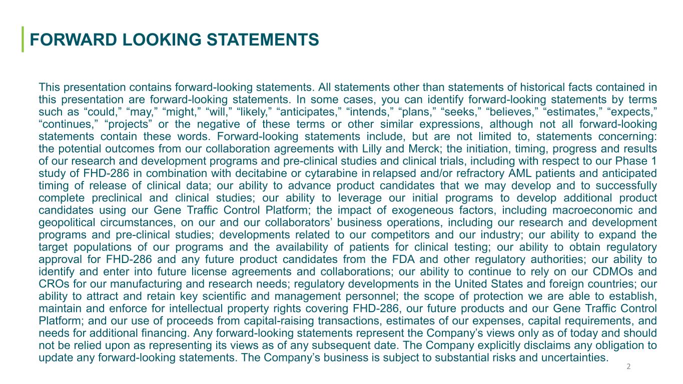 This presentation contains forward-looking statements. All statements other than statements of historical facts contained in this presentation are forward-looking statements. In some cases, you can identify forward-looking statements by terms such as “could,” “may,” “might,” “will,” “likely,” “anticipates,” “intends,” “plans,” “seeks,” “believes,” “estimates,” “expects,” “continues,” “projects” or the negative of these terms or other similar expressions, although not all forward-looking statements contain these words. Forward-looking statements include, but are not limited to, statements concerning: the potential outcomes from our collaboration agreements with Lilly and Merck; the initiation, timing, progress and results of our research and development programs and pre-clinical studies and clinical trials, including with respect to our Phase 1 study of FHD-286 in combination with decitabine or cytarabine in relapsed and/or refractory AML patients and anticipated timing of release of clinical data; our ability to advance product candidates that we may develop and to successfully complete preclinical and clinical studies; our ability to leverage our initial programs to develop additional product candidates using our Gene Traffic Control Platform; the impact of exogeneous factors, including macroeconomic and geopolitical circumstances, on our and our collaborators’ business operations, including our research and development programs and pre-clinical studies; developments related to our competitors and our industry; our ability to expand the target populations of our programs and the availability of patients for clinical testing; our ability to obtain regulatory approval for FHD-286 and any future product candidates from the FDA and other regulatory authorities; our ability to identify and enter into future license agreements and collaborations; our ability to continue to rely on our CDMOs and CROs for our manufacturing and research needs; regulatory developments in the United States and foreign countries; our ability to attract and retain key scientific and management personnel; the scope of protection we are able to establish, maintain and enforce for intellectual property rights covering FHD-286, our future products and our Gene Traffic Control Platform; and our use of proceeds from capital-raising transactions, estimates of our expenses, capital requirements, and needs for additional financing. Any forward-looking statements represent the Company’s views only as of today and should not be relied upon as representing its views as of any subsequent date. The Company explicitly disclaims any obligation to update any forward-looking statements. The Company’s business is subject to substantial risks and uncertainties. Forward-Looking StatementsFORWARD LOOKING STATEMENTS 2