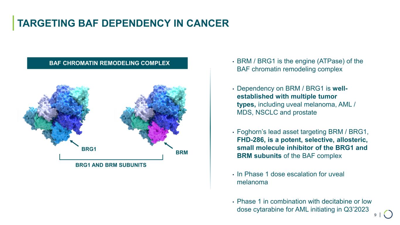 | Selective CBP BROAD PIPELINE ACROSS A RANGE OF TARGETS AND MODALITIES Modality Program Discovery Phase 1 Phase 2 Phase 3 Patient Population* Enzyme Inhibitors Transcription Factor Disruptors Partnered Program AML Combination Study Uveal Melanoma BRG1 Mutated Cancers, e.g. , NSCLC & Bladder Undisclosed Undisclosed FHD-286 (BRG1/BRM) FHD-286 (BRG1/BRM) Selective BRM Undisclosed Undisclosed 3 Discovery Programs UndisclosedUndisclosed Undisclosed 3 Undisclosed Programs Precision Oncology / Breadth and Depth / Over 15 Programs Protein Degraders Selective BRM Selective ARID1B BRG1 Mutated Cancers, e.g., NSCLC & Bladder ARID1A Mutated Cancers, e.g., Ovarian, Endometrial & Colorectal Selective CBP EP300 Mutated Cancers, e.g., Prostate, Bladder, Colorectal, Breast Commercial Rights Over 27,000 Over 5,000 Over 100,000 Over 100,000 Over 175,000 Over 100,000 CBP Mutated & Subsets of EP300 Dependent Cancers Over 100,000EP300 * Per year incidence in the U.S., EU5, Japan | ^ On partial clinical hold FHD-609 (BRD9)^ Synovial Sarcoma & SMARCB1-Loss Tumors Over 2,800 7