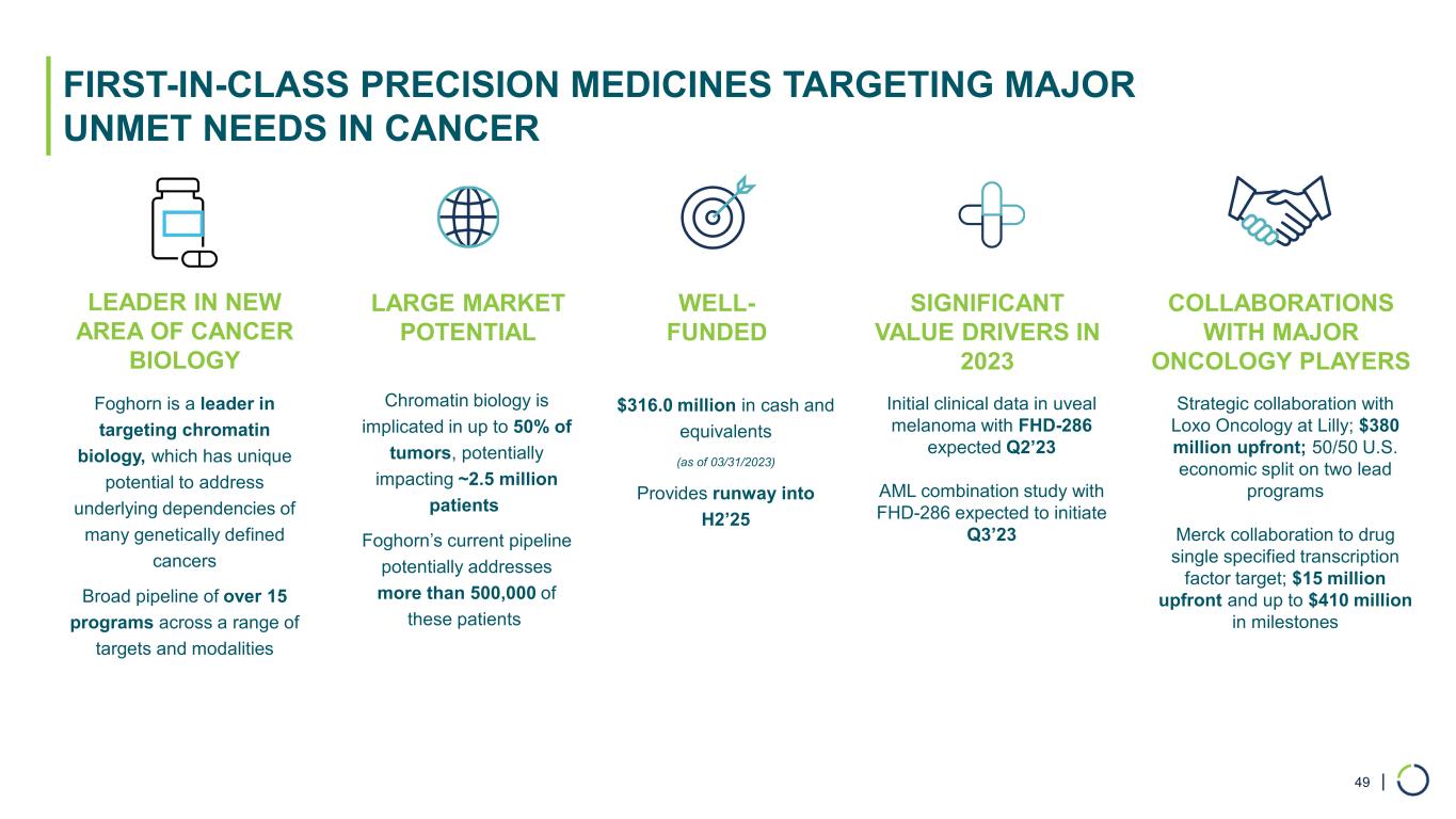 | Selective CBP BROAD PIPELINE ACROSS A RANGE OF TARGETS AND MODALITIES Modality Program Discovery Phase 1 Phase 2 Phase 3 Patient Population* Enzyme Inhibitors Transcription Factor Disruptors Partnered Program AML Combination Study Uveal Melanoma BRG1 Mutated Cancers, e.g. , NSCLC & Bladder Undisclosed Undisclosed FHD-286 (BRG1/BRM) FHD-286 (BRG1/BRM) Selective BRM Undisclosed Undisclosed 3 Discovery Programs UndisclosedUndisclosed Undisclosed 3 Undisclosed Programs Precision Oncology / Breadth and Depth / Over 15 Programs Protein Degraders Selective BRM Selective ARID1B BRG1 Mutated Cancers, e.g., NSCLC & Bladder ARID1A Mutated Cancers, e.g., Ovarian, Endometrial & Colorectal 48 Selective CBP EP300 Mutated Cancers, e.g., Prostate, Bladder, Colorectal, Breast Commercial Rights Over 27,000 Over 5,000 Over 100,000 Over 100,000 Over 175,000 Over 100,000 CBP Mutated & Subsets of EP300 Dependent Cancers Over 100,000EP300 * Per year incidence in the U.S., EU5, Japan | ^ On partial clinical hold FHD-609 (BRD9)^ Synovial Sarcoma & SMARCB1-Loss Tumors Over 2,800