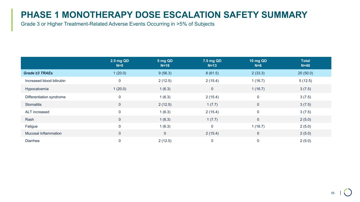 | PHASE 1 MONOTHERAPY DOSE ESCALATION SAFETY SUMMARY 2.5 mg QD N=5 5 mg QD N=16 7.5 mg QD N=13 10 mg QD N=6 Total N=40 Grade ≥3 TRAEs 1 (20.0) 9 (56.3) 8 (61.5) 2 (33.3) 20 (50.0) Increased blood bilirubin 0 2 (12.5) 2 (15.4) 1 (16.7) 5 (12.5) Hypocalcemia 1 (20.0) 1 (6.3) 0 1 (16.7) 3 (7.5) Differentiation syndrome 0 1 (6.3) 2 (15.4) 0 3 (7.5) Stomatitis 0 2 (12.5) 1 (7.7) 0 3 (7.5) ALT increased 0 1 (6.3) 2 (15.4) 0 3 (7.5) Rash 0 1 (6.3) 1 (7.7) 0 2 (5.0) Fatigue 0 1 (6.3) 0 1 (16.7) 2 (5.0) Mucosal Inflammation 0 0 2 (15.4) 0 2 (5.0) Diarrhea 0 2 (12.5) 0 0 2 (5.0) Grade 3 or Higher Treatment-Related Adverse Events Occurring in >5% of Subjects 55