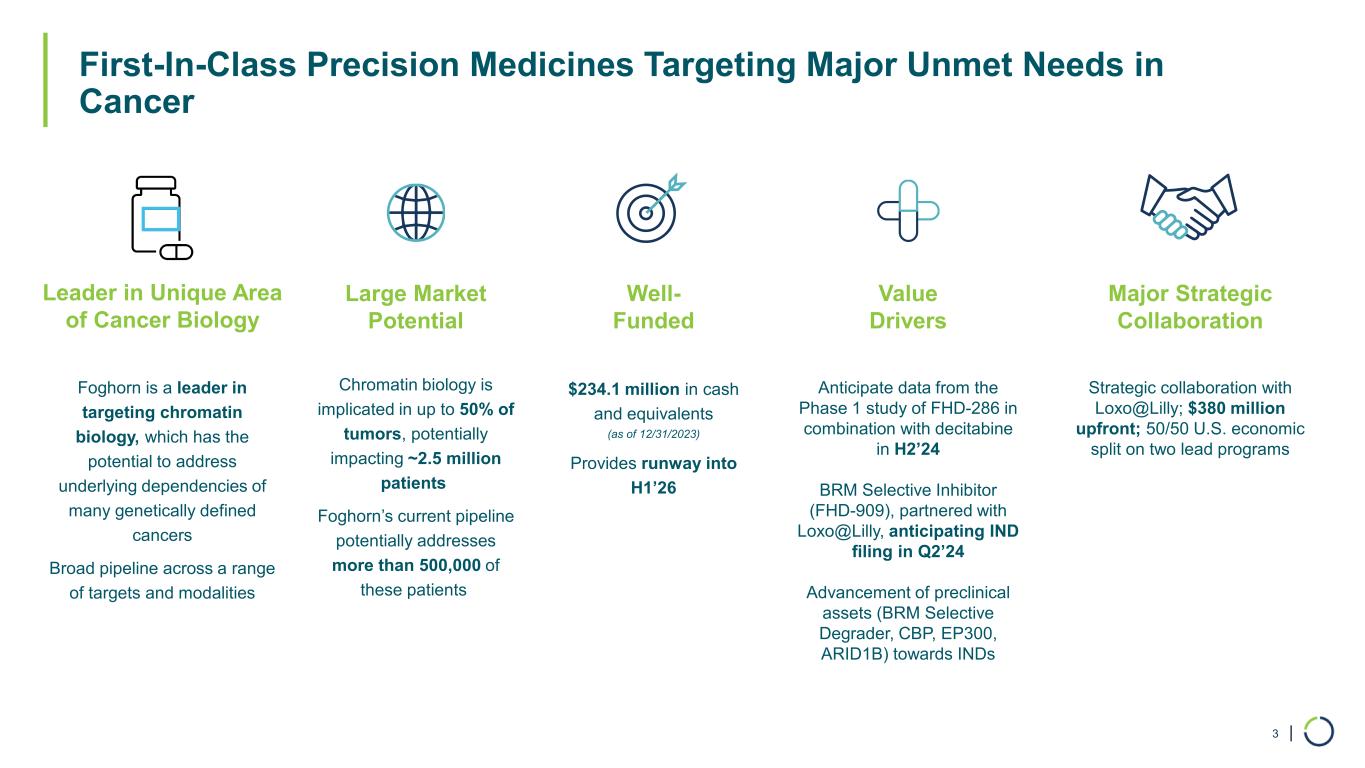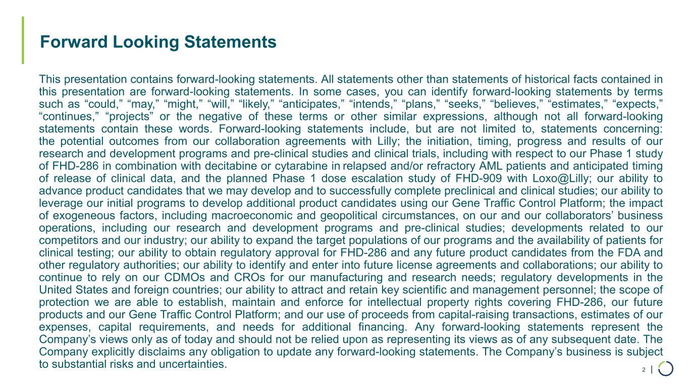 | Forward Looking Statements 2 This presentation contains forward-looking statements. All statements other than statements of historical facts contained in this presentation are forward-looking statements. In some cases, you can identify forward-looking statements by terms such as “could,” “may,” “might,” “will,” “likely,” “anticipates,” “intends,” “plans,” “seeks,” “believes,” “estimates,” “expects,” “continues,” “projects” or the negative of these terms or other similar expressions, although not all forward-looking statements contain these words. Forward-looking statements include, but are not limited to, statements concerning: the potential outcomes from our collaboration agreements with Lilly; the initiation, timing, progress and results of our research and development programs and pre-clinical studies and clinical trials, including with respect to our Phase 1 study of FHD-286 in combination with decitabine or cytarabine in relapsed and/or refractory AML patients and anticipated timing of release of clinical data, and the planned Phase 1 dose escalation study of FHD-909 with Loxo@Lilly; our ability to advance product candidates that we may develop and to successfully complete preclinical and clinical studies; our ability to leverage our initial programs to develop additional product candidates using our Gene Traffic Control Platform; the impact of exogeneous factors, including macroeconomic and geopolitical circumstances, on our and our collaborators’ business operations, including our research and development programs and pre-clinical studies; developments related to our competitors and our industry; our ability to expand the target populations of our programs and the availability of patients for clinical testing; our ability to obtain regulatory approval for FHD-286 and any future product candidates from the FDA and other regulatory authorities; our ability to identify and enter into future license agreements and collaborations; our ability to continue to rely on our CDMOs and CROs for our manufacturing and research needs; regulatory developments in the United States and foreign countries; our ability to attract and retain key scientific and management personnel; the scope of protection we are able to establish, maintain and enforce for intellectual property rights covering FHD-286, our future products and our Gene Traffic Control Platform; and our use of proceeds from capital-raising transactions, estimates of our expenses, capital requirements, and needs for additional financing. Any forward-looking statements represent the Company’s views only as of today and should not be relied upon as representing its views as of any subsequent date. The Company explicitly disclaims any obligation to update any forward-looking statements. The Company’s business is subject to substantial risks and uncertainties.