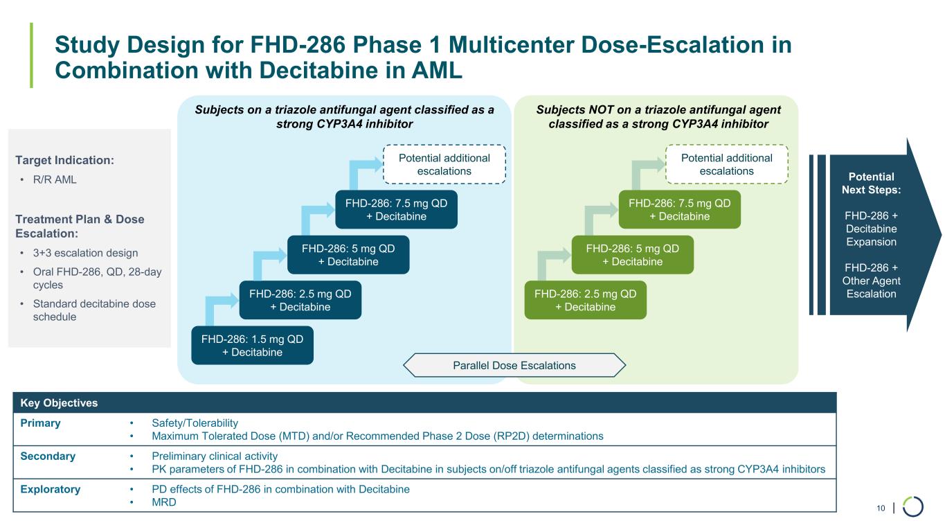 | Study Design for FHD-286 Phase 1 Multicenter Dose-Escalation in Combination with Decitabine in AML 10 Target Indication: • R/R AML Treatment Plan & Dose Escalation: • 3+3 escalation design • Oral FHD-286, QD, 28-day cycles • Standard decitabine dose schedule Key Objectives Primary • Safety/Tolerability • Maximum Tolerated Dose (MTD) and/or Recommended Phase 2 Dose (RP2D) determinations Secondary • Preliminary clinical activity • PK parameters of FHD-286 in combination with Decitabine in subjects on/off triazole antifungal agents classified as strong CYP3A4 inhibitors Exploratory • PD effects of FHD-286 in combination with Decitabine • MRD FHD-286: 1.5 mg QD + Decitabine FHD-286: 2.5 mg QD + Decitabine FHD-286: 5 mg QD + Decitabine FHD-286: 7.5 mg QD + Decitabine FHD-286: 2.5 mg QD + Decitabine FHD-286: 5 mg QD + Decitabine FHD-286: 7.5 mg QD + Decitabine Potential Next Steps: FHD-286 + Decitabine Expansion FHD-286 + Other Agent Escalation Subjects on a triazole antifungal agent classified as a strong CYP3A4 inhibitor Subjects NOT on a triazole antifungal agent classified as a strong CYP3A4 inhibitor Parallel Dose Escalations Potential additional escalations Potential additional escalations