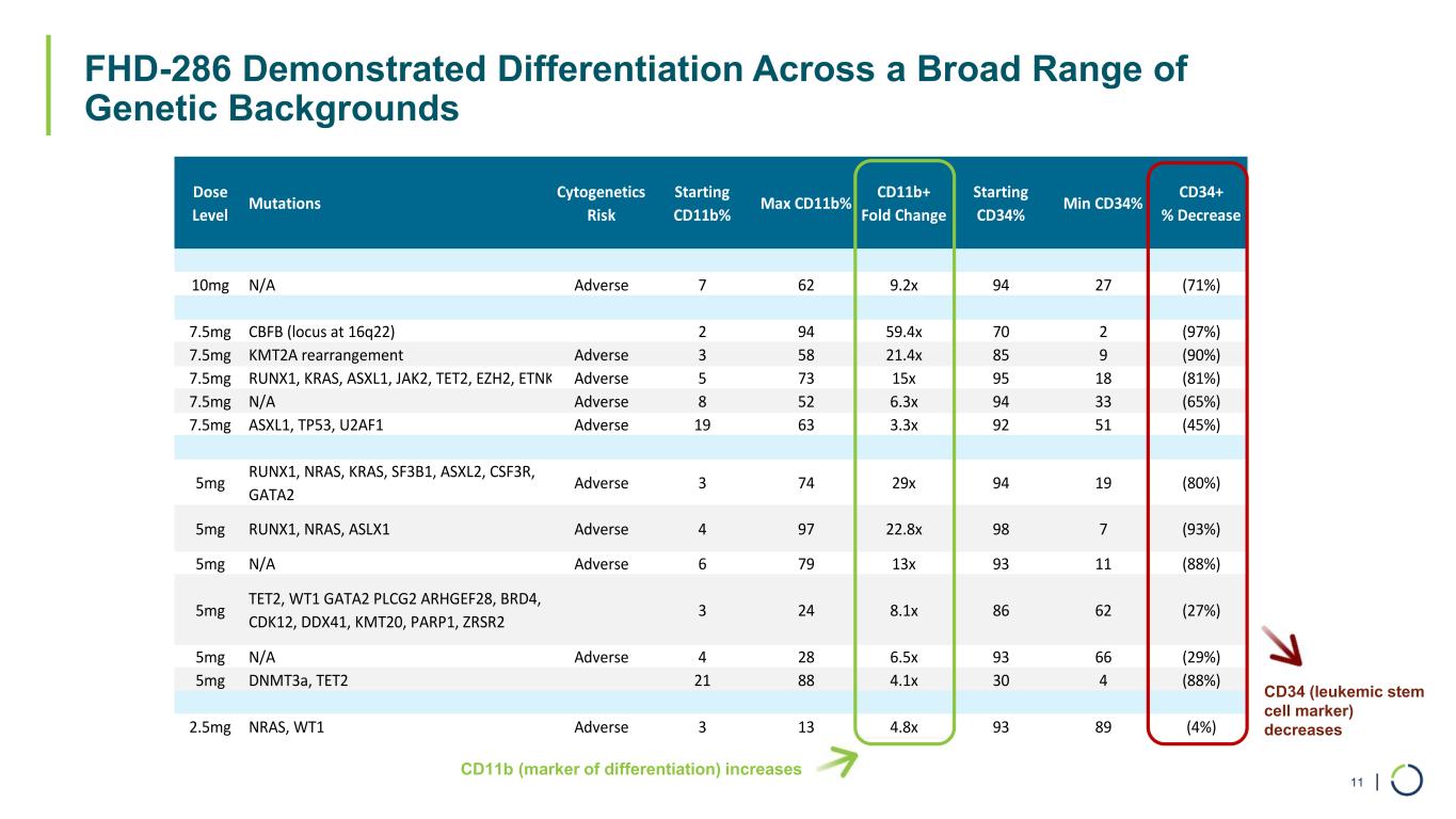 | FHD-286 Demonstrated Differentiation Across a Broad Range of Genetic Backgrounds 11 Dose Level Mutations Cytogenetics Risk Starting CD11b% Max CD11b% CD11b+ Fold Change Starting CD34% Min CD34% CD34+ % Decrease 10mg N/A Adverse 7 62 9.2x 94 27 (71%) 7.5mg CBFB (locus at 16q22) 2 94 59.4x 70 2 (97%) 7.5mg KMT2A rearrangement Adverse 3 58 21.4x 85 9 (90%) 7.5mg RUNX1, KRAS, ASXL1, JAK2, TET2, EZH2, ETNK Adverse 5 73 15x 95 18 (81%) 7.5mg N/A Adverse 8 52 6.3x 94 33 (65%) 7.5mg ASXL1, TP53, U2AF1 Adverse 19 63 3.3x 92 51 (45%) 5mg RUNX1, NRAS, KRAS, SF3B1, ASXL2, CSF3R, GATA2 Adverse 3 74 29x 94 19 (80%) 5mg RUNX1, NRAS, ASLX1 Adverse 4 97 22.8x 98 7 (93%) 5mg N/A Adverse 6 79 13x 93 11 (88%) 5mg TET2, WT1 GATA2 PLCG2 ARHGEF28, BRD4, CDK12, DDX41, KMT20, PARP1, ZRSR2 3 24 8.1x 86 62 (27%) 5mg N/A Adverse 4 28 6.5x 93 66 (29%) 5mg DNMT3a, TET2 21 88 4.1x 30 4 (88%) 2.5mg NRAS, WT1 Adverse 3 13 4.8x 93 89 (4%) CD11b (marker of differentiation) increases CD34 (leukemic stem cell marker) decreases