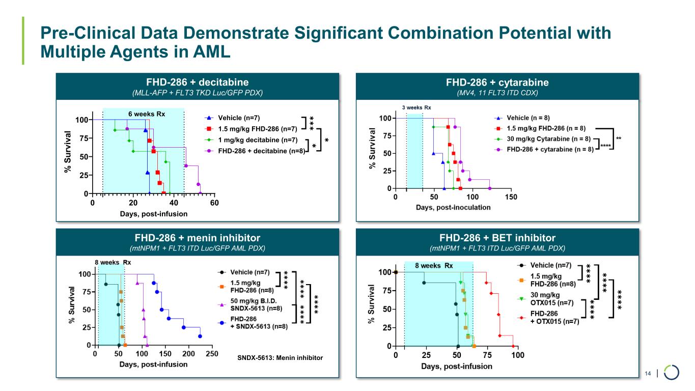 | Absolute Neutrophil Count (ANC) Peripheral Blast Count Meaningful Clinical Benefit in Heavily Pre-Treated Patient 13 100% 0% 50% 10 5 10/13/21 10/24/21 11/4/21 11/14/21 11/25/21 12/6/21 0 Initiation of FHD 286 1st SCT 2nd SCT Patient Background: • 25-year-old male, treatment-related AML • KMT2A rearrangement Prior AML Treatment: • Progressive disease with CNS Leukemia: 7 lines prior treatment and 2 bone marrow transplants Prior non-AML treatment: • Ewing’s sarcoma: Treated with Chemo/RT/Surgery (VCR, doxo, cyclophos, ifos, etoposide) Initiation of FHD-286 at 10 MG Dose: • Drop in peripheral blast, 97% to 5% • Bone marrow reduction from 89% to 48%, with ANC recovery 5/23/19 11/22/19 5/22/20 5/23/2111/21/20 11/22/21 Initiation of FHD 286