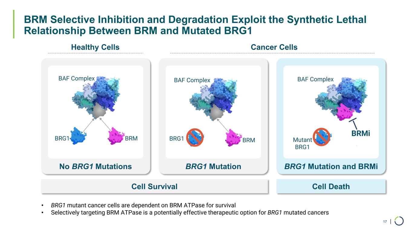 | BRM Selective Inhibitor FHD-909 IND Targeted in Q2’24, BRM Selective Degrader Continues Late-Stage Pre-Clinical Development 16 BRM Selective Inhibitor (FHD-909) BRM Selective Degrader Biology Exploit the synthetic lethal relationship between BRM (SMARCA2) and mutated BRG1 (SMARCA4) Stage IND submission planned in Q2’24 Advancing in parallel through late pre- clinical development Opportunity BRG1 mutated cancer including ~10% of NSCLC and up to 5% of all solid tumors Loxo@Lilly Partnership 50/50 global R&D cost share | 50/50 U.S. economics | tiered ex-U.S. royalties starting in the low double-digit range and escalating into the twenties