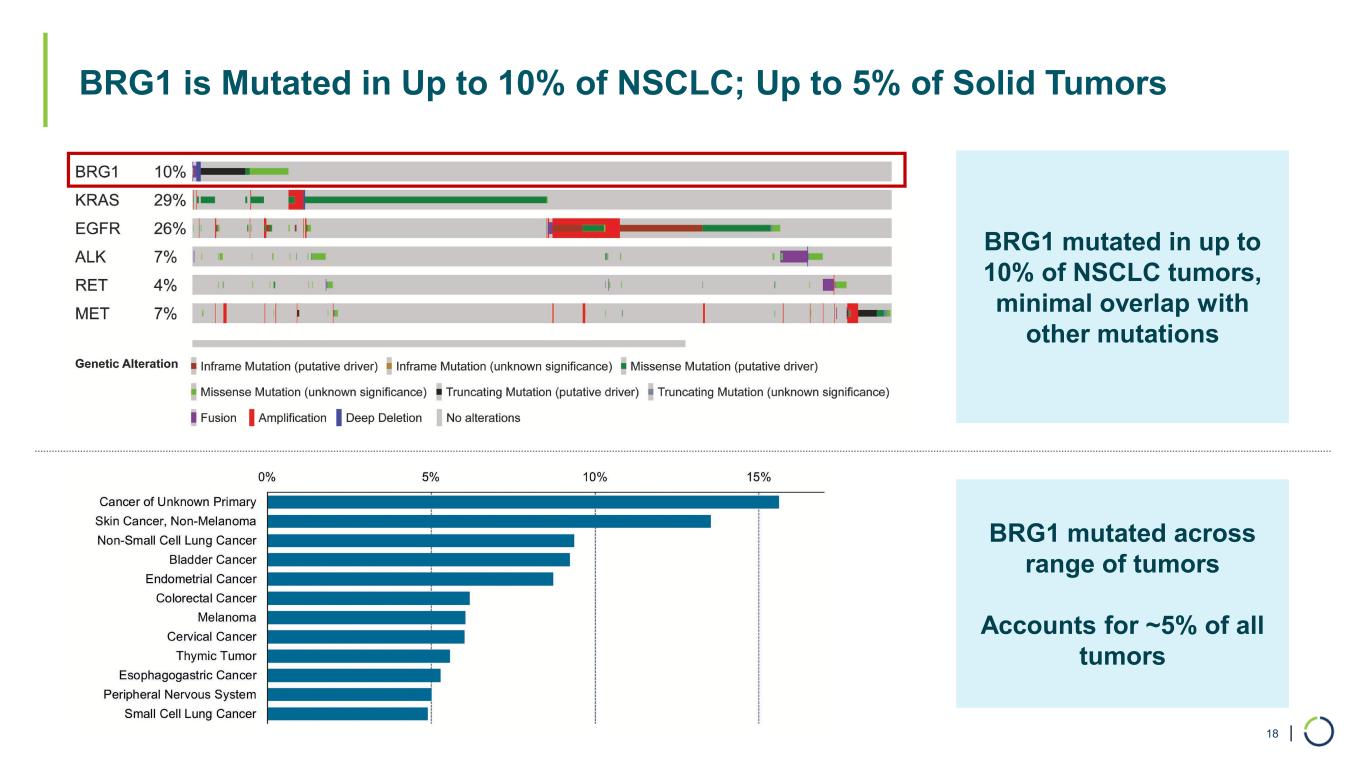 | BRG1 is Mutated in Up to 10% of NSCLC; Up to 5% of Solid Tumors 18 BRG1 mutated across range of tumors Accounts for ~5% of all tumors BRG1 mutated in up to 10% of NSCLC tumors, minimal overlap with other mutations