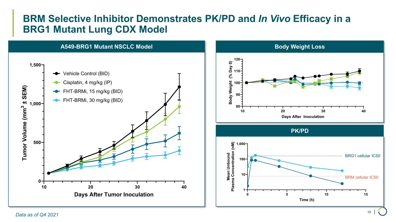 | BRM Selective Inhibitor Demonstrates PK/PD and In Vivo Efficacy in a BRG1 Mutant Lung CDX Model 19 PK/PD Body Weight LossA549-BRG1 Mutant NSCLC Model BRG1 cellular IC50 BRM cellular IC50 0 5 10 15 1 10 100 1,000 Time (h) M ea n U nb ou nd Pl as m a C on ce nt ra tio n (n M ) 10 20 30 40 0 500 1,000 1,500 Days After Tumor Inoculation Tu m or V ol um e (m m 3 ± S EM ) Vehicle Control (BID) Cisplatin, 4 mg/kg (IP) FHT-BRMi, 15 mg/kg (BID) FHT-BRMi, 30 mg/kg (BID) 10 20 30 40 80 90 100 110 120 Days After Inoculation B od y W ei gh t (% D ay 0 ) Data as of Q4 2021