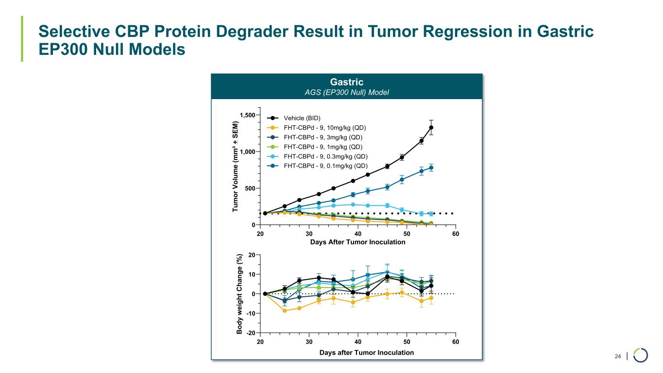 | Selective CBP Protein Degrader Result in Tumor Regression in Gastric EP300 Null Models 24 Gastric AGS (EP300 Null) Model 20 30 40 50 60 -20 -10 0 10 20 B od y w ei gh t C ha ng e (% ) Days after Tumor Inoculation 20 30 40 50 60 0 500 1,000 1,500 Days After Tumor Inoculation Tu m or V ol um e (m m ³+ S EM ) Vehicle (BID) FHT-CBPd - 9, 10mg/kg (QD) FHT-CBPd - 9, 3mg/kg (QD) FHT-CBPd - 9, 1mg/kg (QD) FHT-CBPd - 9, 0.3mg/kg (QD) FHT-CBPd - 9, 0.1mg/kg (QD)
