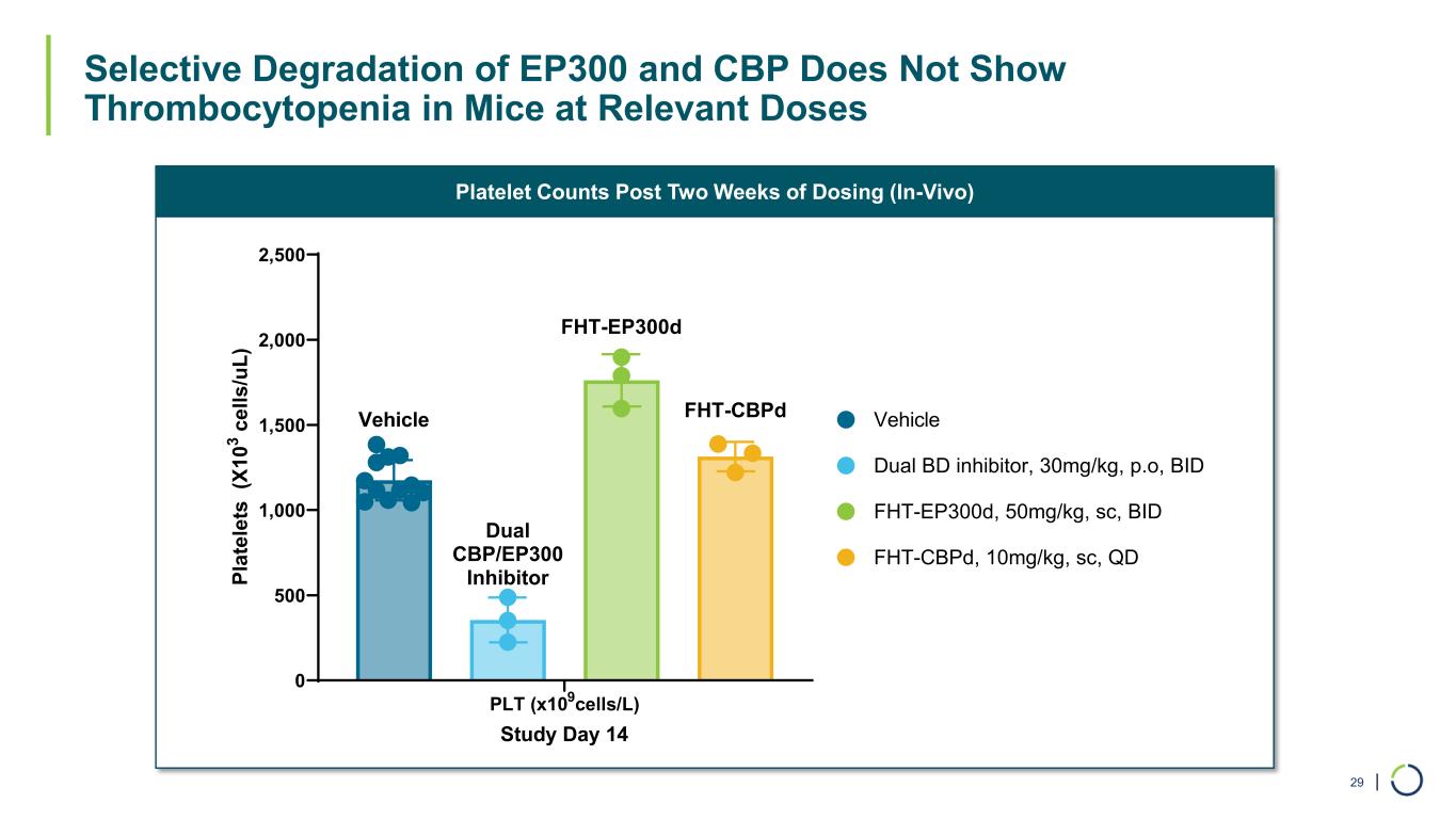 | Platelet Counts Post Two Weeks of Dosing (In-Vivo) Selective Degradation of EP300 and CBP Does Not Show Thrombocytopenia in Mice at Relevant Doses 29 PLT (x109cells/L) 0 500 1,000 1,500 2,000 2,500 Study Day 14 Pl at el et s (X 10 3 c el ls /u L) Vehicle FHT-EP300d, 50mg/kg, sc, BID FHT-CBPd, 10mg/kg, sc, QD Dual BD inhibitor, 30mg/kg, p.o, BID FHT-EP300d FHT-CBPd Dual CBP/EP300 Inhibitor Vehicle