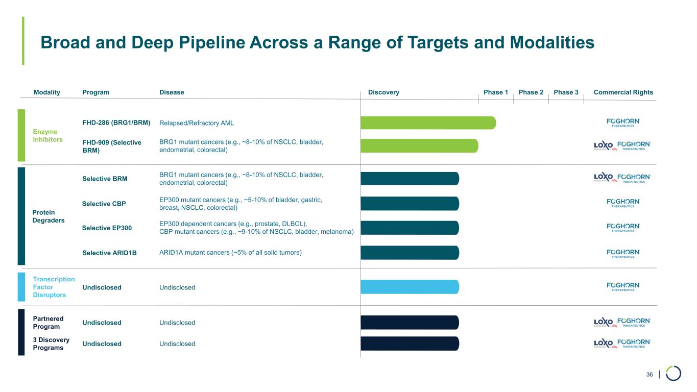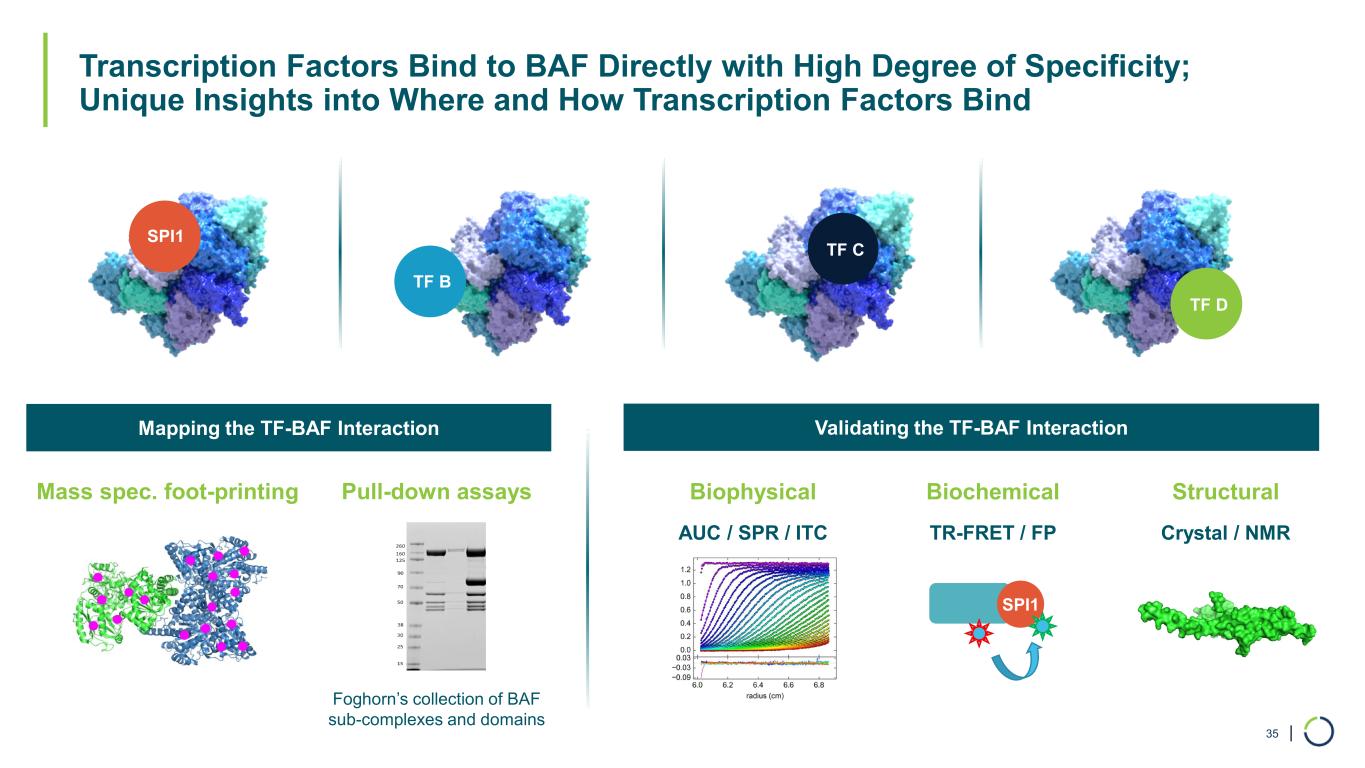 | Foghorn’s Novel Approach to Drugging Transcription Factors Enabled by Its Protein Production and Discovery Capabilities 34 • Highly involved in gene expression • Implicated in range of cancers and other diseases • Featureless surface: no druggable binding pocket • Tight interactions with DNA: undruggable affinities • Druggable binding pockets • Druggable affinities Transcription Factors are Compelling Drug Targets… …But Historically Difficult to Target… Foghorn Has a New Approach Focusing on Interaction with BAF HISTORICAL FOCUS POTENTIAL DRUGGABLE SITES FOGHORN’S FOCUS