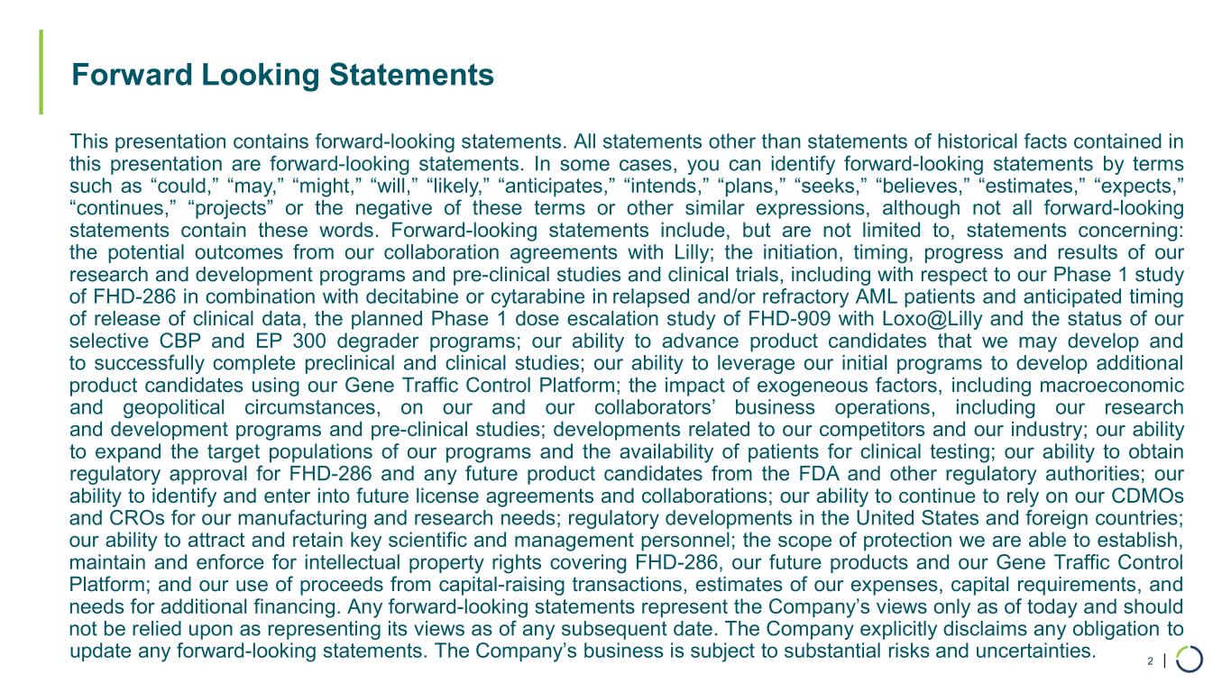 | Forward Looking Statements 2 This presentation contains forward-looking statements. All statements other than statements of historical facts contained in this presentation are forward-looking statements. In some cases, you can identify forward-looking statements by terms such as “could,” “may,” “might,” “will,” “likely,” “anticipates,” “intends,” “plans,” “seeks,” “believes,” “estimates,” “expects,” “continues,” “projects” or the negative of these terms or other similar expressions, although not all forward-looking statements contain these words. Forward-looking statements include, but are not limited to, statements concerning: the potential outcomes from our collaboration agreements with Lilly; the initiation, timing, progress and results of our research and development programs and pre-clinical studies and clinical trials, including with respect to our Phase 1 study of FHD-286 in combination with decitabine or cytarabine in relapsed and/or refractory AML patients and anticipated timing of release of clinical data, the planned Phase 1 dose escalation study of FHD-909 with Loxo@Lilly and the status of our selective CBP and EP 300 degrader programs; our ability to advance product candidates that we may develop and to successfully complete preclinical and clinical studies; our ability to leverage our initial programs to develop additional product candidates using our Gene Traffic Control Platform; the impact of exogeneous factors, including macroeconomic and geopolitical circumstances, on our and our collaborators’ business operations, including our research and development programs and pre-clinical studies; developments related to our competitors and our industry; our ability to expand the target populations of our programs and the availability of patients for clinical testing; our ability to obtain regulatory approval for FHD-286 and any future product candidates from the FDA and other regulatory authorities; our ability to identify and enter into future license agreements and collaborations; our ability to continue to rely on our CDMOs and CROs for our manufacturing and research needs; regulatory developments in the United States and foreign countries; our ability to attract and retain key scientific and management personnel; the scope of protection we are able to establish, maintain and enforce for intellectual property rights covering FHD-286, our future products and our Gene Traffic Control Platform; and our use of proceeds from capital-raising transactions, estimates of our expenses, capital requirements, and needs for additional financing. Any forward-looking statements represent the Company’s views only as of today and should not be relied upon as representing its views as of any subsequent date. The Company explicitly disclaims any obligation to update any forward-looking statements. The Company’s business is subject to substantial risks and uncertainties.