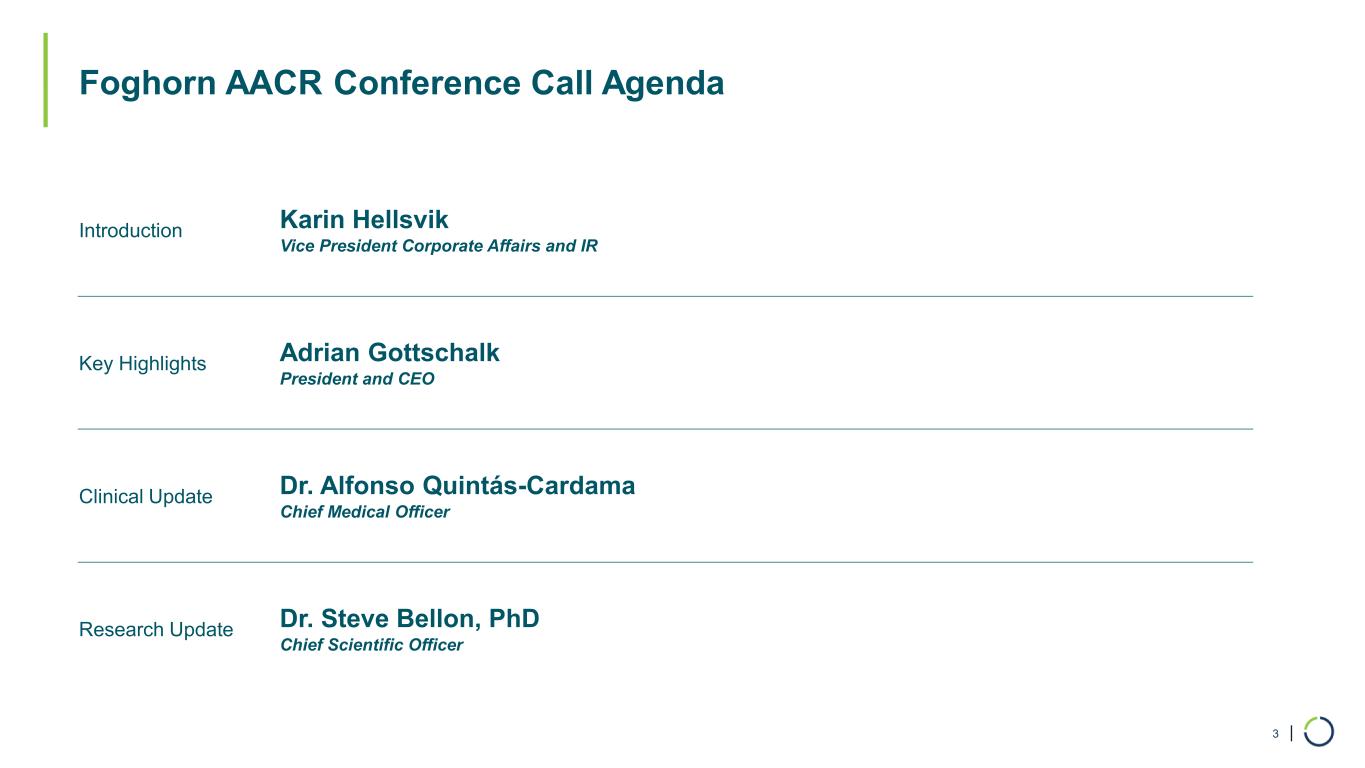 | Foghorn AACR Conference Call Agenda 3 Introduction Karin Hellsvik Vice President Corporate Affairs and IR Key Highlights Adrian Gottschalk President and CEO Clinical Update Dr. Alfonso Quintás-Cardama Chief Medical Officer Research Update Dr. Steve Bellon, PhD Chief Scientific Officer