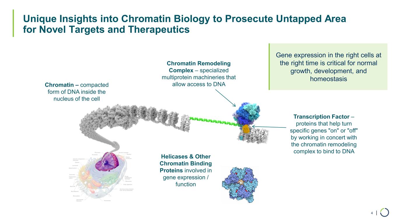 | Unique Insights into Chromatin Biology to Prosecute Untapped Area for Novel Targets and Therapeutics 4 Chromatin – compacted form of DNA inside the nucleus of the cell Chromatin Remodeling Complex – specialized multiprotein machineries that allow access to DNA Transcription Factor – proteins that help turn specific genes "on" or "off" by working in concert with the chromatin remodeling complex to bind to DNA Helicases & Other Chromatin Binding Proteins involved in gene expression / function Gene expression in the right cells at the right time is critical for normal growth, development, and homeostasis
