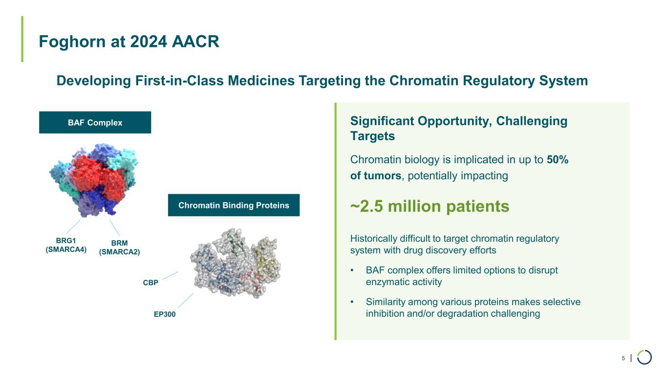 | Foghorn at 2024 AACR 5 BAF Complex BRG1 (SMARCA4) BRM (SMARCA2) Chromatin Binding Proteins CBP EP300 Significant Opportunity, Challenging Targets Developing First-in-Class Medicines Targeting the Chromatin Regulatory System Chromatin biology is implicated in up to 50% of tumors, potentially impacting ~2.5 million patients Historically difficult to target chromatin regulatory system with drug discovery efforts • BAF complex offers limited options to disrupt enzymatic activity • Similarity among various proteins makes selective inhibition and/or degradation challenging