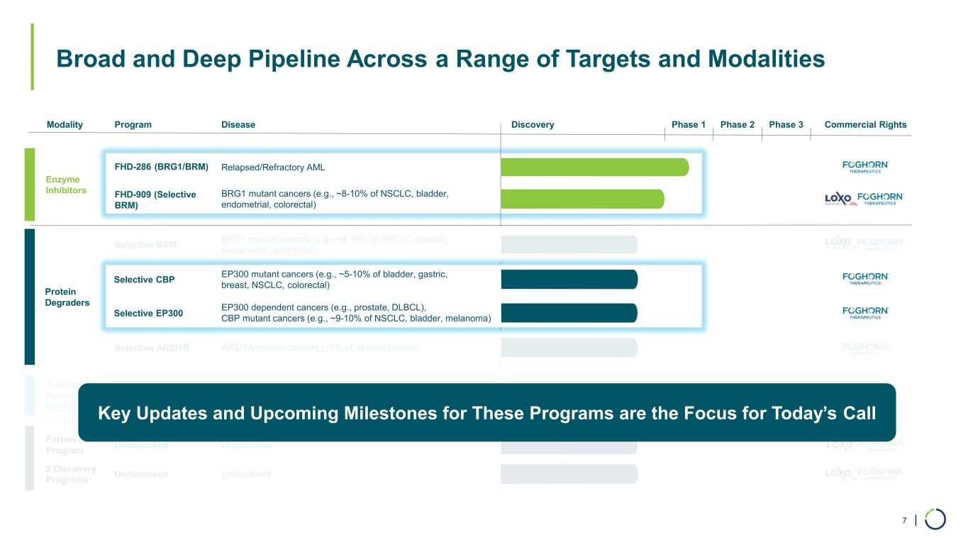 | Broad and Deep Pipeline Across a Range of Targets and Modalities 6 Modality Program Discovery Phase 1 Phase 2 Phase 3 Enzyme Inhibitors Transcription Factor Disruptors Undisclosed Protein Degraders Commercial Rights FHD-286 (BRG1/BRM) FHD-909 (Selective BRM) 3 Discovery Programs Undisclosed Partnered Program Undisclosed Disease BRG1 mutant cancers (e.g., ~8-10% of NSCLC, bladder, endometrial, colorectal) Relapsed/Refractory AML Selective BRM BRG1 mutant cancers (e.g., ~8-10% of NSCLC, bladder, endometrial, colorectal) Selective ARID1B ARID1A mutant cancers (~5% of all solid tumors) Selective CBP EP300 mutant cancers (e.g., ~5-10% of bladder, gastric, breast, NSCLC, colorectal) Selective EP300 EP300 dependent cancers (e.g., prostate, DLBCL), CBP mutant cancers (e.g., ~9-10% of NSCLC, bladder, melanoma) Undisclosed Undisclosed Undisclosed