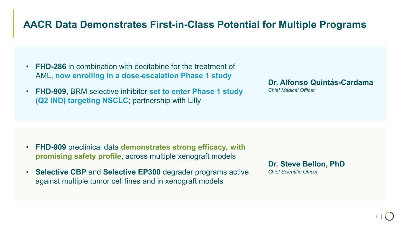 | Broad and Deep Pipeline Across a Range of Targets and Modalities 7 Modality Program Discovery Phase 1 Phase 2 Phase 3 Enzyme Inhibitors Transcription Factor Disruptors Undisclosed Protein Degraders Commercial Rights 3 Discovery Programs Undisclosed Partnered Program Undisclosed Disease Selective BRM BRG1 mutant cancers (e.g., ~8-10% of NSCLC, bladder, endometrial, colorectal) Selective ARID1B ARID1A mutant cancers (~5% of all solid tumors) Undisclosed Undisclosed Undisclosed Key Updates and Upcoming Milestones for These Programs are the Focus for Today’s Call FHD-286 (BRG1/BRM) FHD-909 (Selective BRM) BRG1 mutant cancers (e.g., ~8-10% of NSCLC, bladder, endometrial, colorectal) Relapsed/Refractory AML Selective CBP EP300 mutant cancers (e.g., ~5-10% of bladder, gastric, breast, NSCLC, colorectal) Selective EP300 EP300 dependent cancers (e.g., prostate, DLBCL), CBP mutant cancers (e.g., ~9-10% of NSCLC, bladder, melanoma)