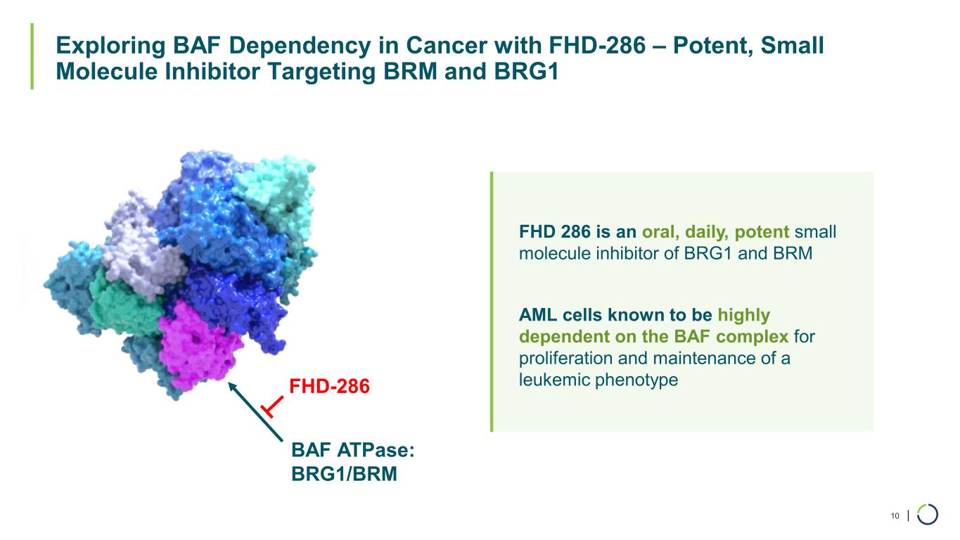 | Exploring BAF Dependency in Cancer with FHD-286 – Potent, Small Molecule Inhibitor Targeting BRM and BRG1 10 BAF ATPase: BRG1/BRM FHD-286 FHD 286 is an oral, daily, potent small molecule inhibitor of BRG1 and BRM AML cells known to be highly dependent on the BAF complex for proliferation and maintenance of a leukemic phenotype