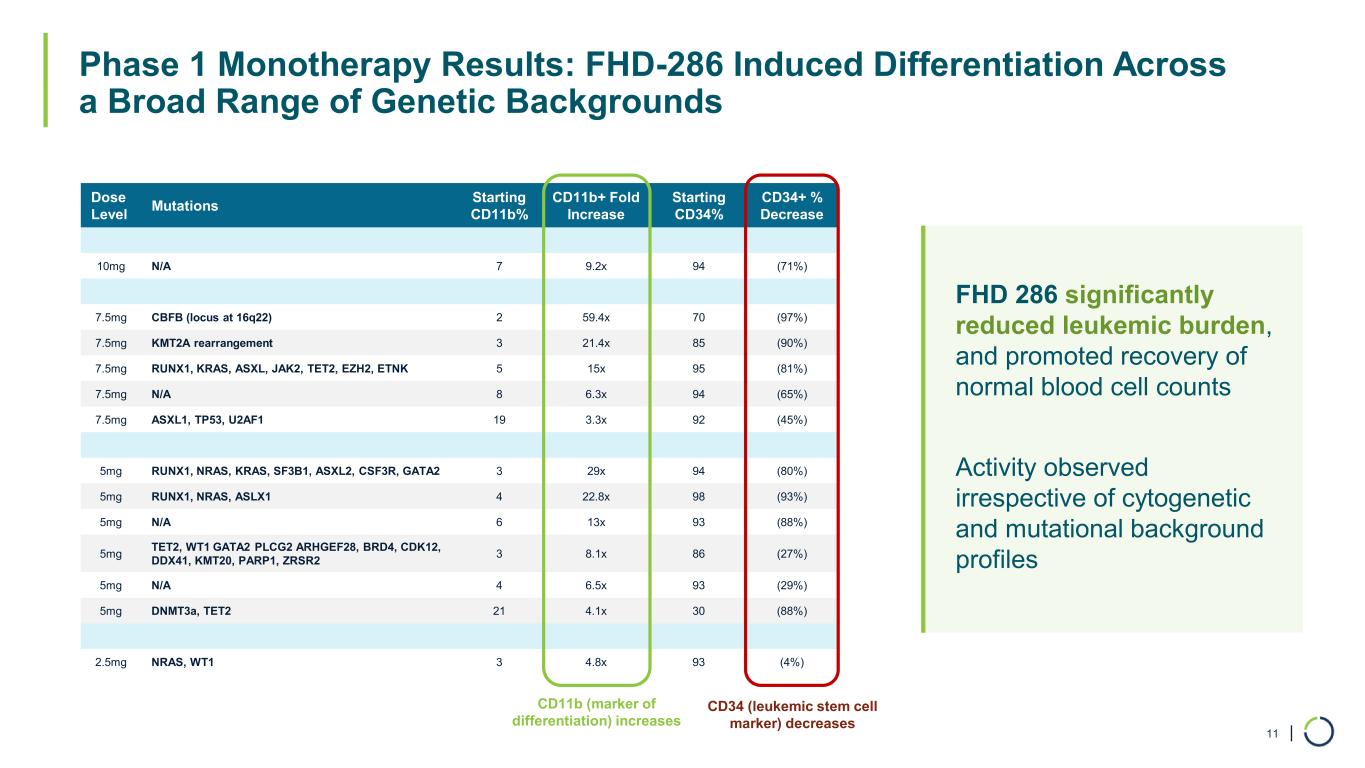 | Phase 1 Monotherapy Results: FHD-286 Induced Differentiation Across a Broad Range of Genetic Backgrounds 11 Dose Level Mutations Starting CD11b% CD11b+ Fold Increase Starting CD34% CD34+ % Decrease 10mg N/A 7 9.2x 94 (71%) 7.5mg CBFB (locus at 16q22) 2 59.4x 70 (97%) 7.5mg KMT2A rearrangement 3 21.4x 85 (90%) 7.5mg RUNX1, KRAS, ASXL, JAK2, TET2, EZH2, ETNK 5 15x 95 (81%) 7.5mg N/A 8 6.3x 94 (65%) 7.5mg ASXL1, TP53, U2AF1 19 3.3x 92 (45%) 5mg RUNX1, NRAS, KRAS, SF3B1, ASXL2, CSF3R, GATA2 3 29x 94 (80%) 5mg RUNX1, NRAS, ASLX1 4 22.8x 98 (93%) 5mg N/A 6 13x 93 (88%) 5mg TET2, WT1 GATA2 PLCG2 ARHGEF28, BRD4, CDK12, DDX41, KMT20, PARP1, ZRSR2 3 8.1x 86 (27%) 5mg N/A 4 6.5x 93 (29%) 5mg DNMT3a, TET2 21 4.1x 30 (88%) 2.5mg NRAS, WT1 3 4.8x 93 (4%) CD11b (marker of differentiation) increases CD34 (leukemic stem cell marker) decreases FHD 286 significantly reduced leukemic burden, and promoted recovery of normal blood cell counts Activity observed irrespective of cytogenetic and mutational background profiles