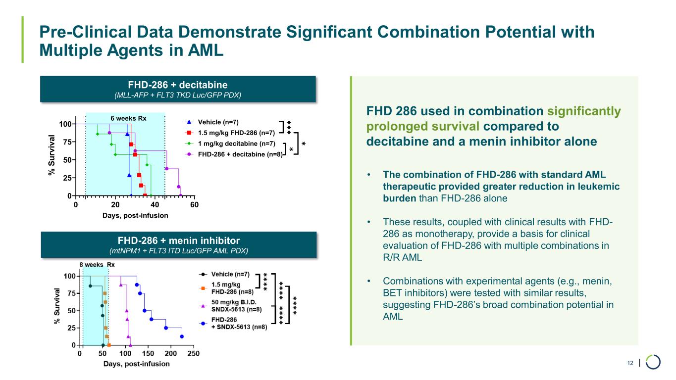 | FHD-286 + decitabine (MLL-AFP + FLT3 TKD Luc/GFP PDX) Pre-Clinical Data Demonstrate Significant Combination Potential with Multiple Agents in AML 12 FHD-286 + menin inhibitor (mtNPM1 + FLT3 ITD Luc/GFP AML PDX) 0 20 40 60 0 25 50 75 100 Days, post-infusion % S ur vi va l FHD-286 + decitabine (n=8) 1 mg/kg decitabine (n=7) 1.5 mg/kg FHD-286 (n=7) Vehicle (n=7)6 weeks Rx ✱ ✱ ✱ ✱ ✱ FHD 286 used in combination significantly prolonged survival compared to decitabine and a menin inhibitor alone • The combination of FHD-286 with standard AML therapeutic provided greater reduction in leukemic burden than FHD-286 alone • These results, coupled with clinical results with FHD- 286 as monotherapy, provide a basis for clinical evaluation of FHD-286 with multiple combinations in R/R AML • Combinations with experimental agents (e.g., menin, BET inhibitors) were tested with similar results, suggesting FHD-286’s broad combination potential in AML