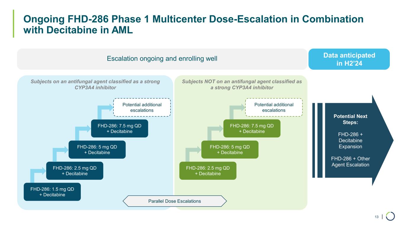 | Ongoing FHD-286 Phase 1 Multicenter Dose-Escalation in Combination with Decitabine in AML 13 FHD-286: 1.5 mg QD + Decitabine FHD-286: 2.5 mg QD + Decitabine FHD-286: 5 mg QD + Decitabine FHD-286: 7.5 mg QD + Decitabine FHD-286: 2.5 mg QD + Decitabine FHD-286: 5 mg QD + Decitabine FHD-286: 7.5 mg QD + Decitabine Potential Next Steps: FHD-286 + Decitabine Expansion FHD-286 + Other Agent Escalation Subjects on an antifungal agent classified as a strong CYP3A4 inhibitor Subjects NOT on an antifungal agent classified as a strong CYP3A4 inhibitor Parallel Dose Escalations Potential additional escalations Potential additional escalations Escalation ongoing and enrolling well Data anticipated in H2’24