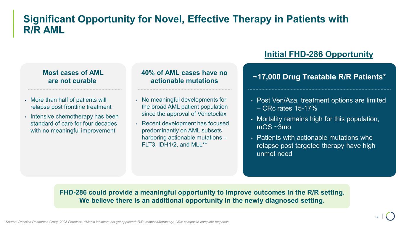 | Significant Opportunity for Novel, Effective Therapy in Patients with R/R AML 14 • More than half of patients will relapse post frontline treatment • Intensive chemotherapy has been standard of care for four decades with no meaningful improvement Most cases of AML are not curable 40% of AML cases have no actionable mutations • No meaningful developments for the broad AML patient population since the approval of Venetoclax • Recent development has focused predominantly on AML subsets harboring actionable mutations – FLT3, IDH1/2, and MLL** ̽ Source: Decision Resources Group 2025 Forecast: **Menin inhibitors not yet approved; R/R: relapsed/refractory; CRc: composite complete response • Post Ven/Aza, treatment options are limited – CRc rates 15-17% • Mortality remains high for this population, mOS ~3mo • Patients with actionable mutations who relapse post targeted therapy have high unmet need Initial FHD-286 Opportunity ~17,000 Drug Treatable R/R Patients* FHD-286 could provide a meaningful opportunity to improve outcomes in the R/R setting. We believe there is an additional opportunity in the newly diagnosed setting.