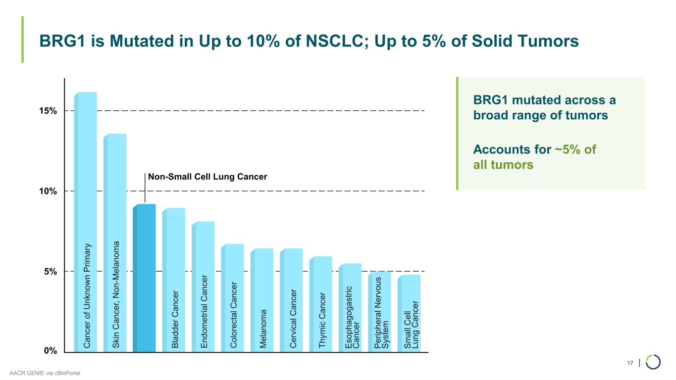 | BRG1 is Mutated in Up to 10% of NSCLC; Up to 5% of Solid Tumors 17 BRG1 mutated across a broad range of tumors Accounts for ~5% of all tumors AACR GENIE via cBioPortal
