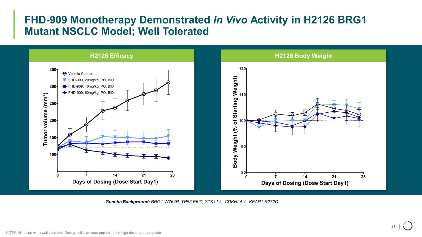 | FHD-909 Monotherapy Demonstrated In Vivo Activity in H2126 BRG1 Mutant NSCLC Model; Well Tolerated 21 H2126 Efficacy H2126 Body Weight Genetic Background: BRG1 W764R, TP53 E62*, STK11-/-, CDKN2A-/-, KEAP1 R272C NOTE: All doses were well tolerated. Dosing holidays were applied at the high dose, as appropriate 0 7 14 21 28 100 150 200 250 300 350 Days of Dosing (Dose Start Day1) Tu m or v ol um e (m m 3 ) Vehicle Control FHD-909, 20mg/kg, PO, BID FHD-909, 40mg/kg, PO, BID FHD-909, 60mg/kg, PO, BID 0 7 14 21 28 80 90 100 110 120 Days of Dosing (Dose Start Day1) B od y W ei gh t ( % o f S ta rt in g W ei gh t)