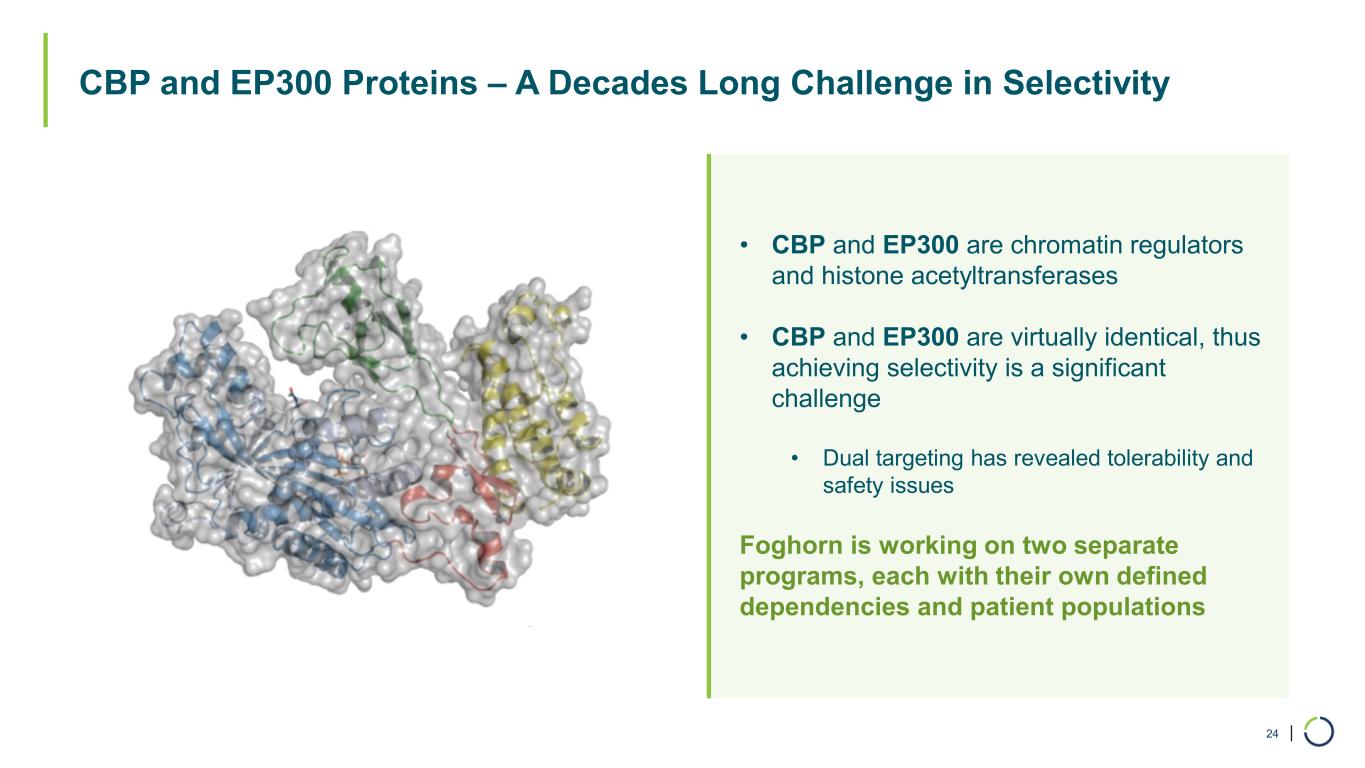 | CBP and EP300 Proteins – A Decades Long Challenge in Selectivity 24 • CBP and EP300 are chromatin regulators and histone acetyltransferases • CBP and EP300 are virtually identical, thus achieving selectivity is a significant challenge • Dual targeting has revealed tolerability and safety issues Foghorn is working on two separate programs, each with their own defined dependencies and patient populations