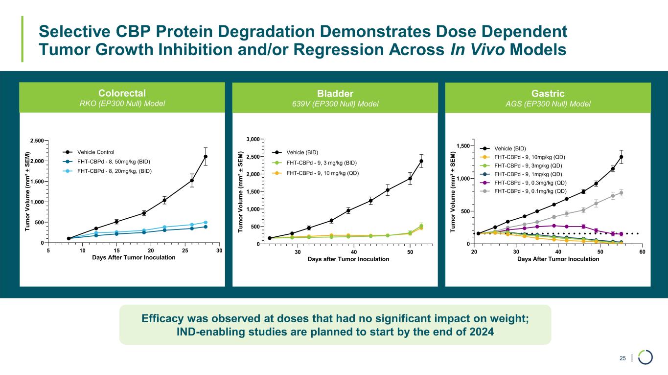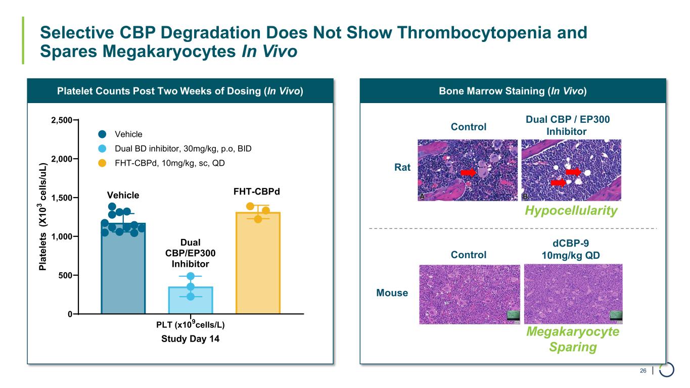 | 25 Selective CBP Protein Degradation Demonstrates Dose Dependent Tumor Growth Inhibition and/or Regression Across In Vivo Models Gastric AGS (EP300 Null) Model Bladder 639V (EP300 Null) Model Colorectal RKO (EP300 Null) Model 30 40 50 0 500 1,000 1,500 2,000 2,500 3,000 Days after Tumor Inoculation Tu m or V ol um e (m m ³+ S EM ) Vehicle (BID) FHT-CBPd - 9, 3 mg/kg (BID) FHT-CBPd - 9, 10 mg/kg (QD) 5 10 15 20 25 30 0 500 1,000 1,500 2,000 2,500 Days After Tumor Inoculation Tu m or V ol um e (m m ³ + S EM ) Vehicle Control FHT-CBPd - 8, 50mg/kg (BID) FHT-CBPd - 8, 20mg/kg, (BID) 20 30 40 50 60 0 500 1,000 1,500 Days After Tumor Inoculation Tu m or V ol um e (m m ³ + S EM ) Vehicle (BID) FHT-CBPd - 9, 10mg/kg (QD) FHT-CBPd - 9, 3mg/kg (QD) FHT-CBPd - 9, 1mg/kg (QD) FHT-CBPd - 9, 0.3mg/kg (QD) FHT-CBPd - 9, 0.1mg/kg (QD) Efficacy was observed at doses that had no significant impact on weight; IND-enabling studies are planned to start by the end of 2024