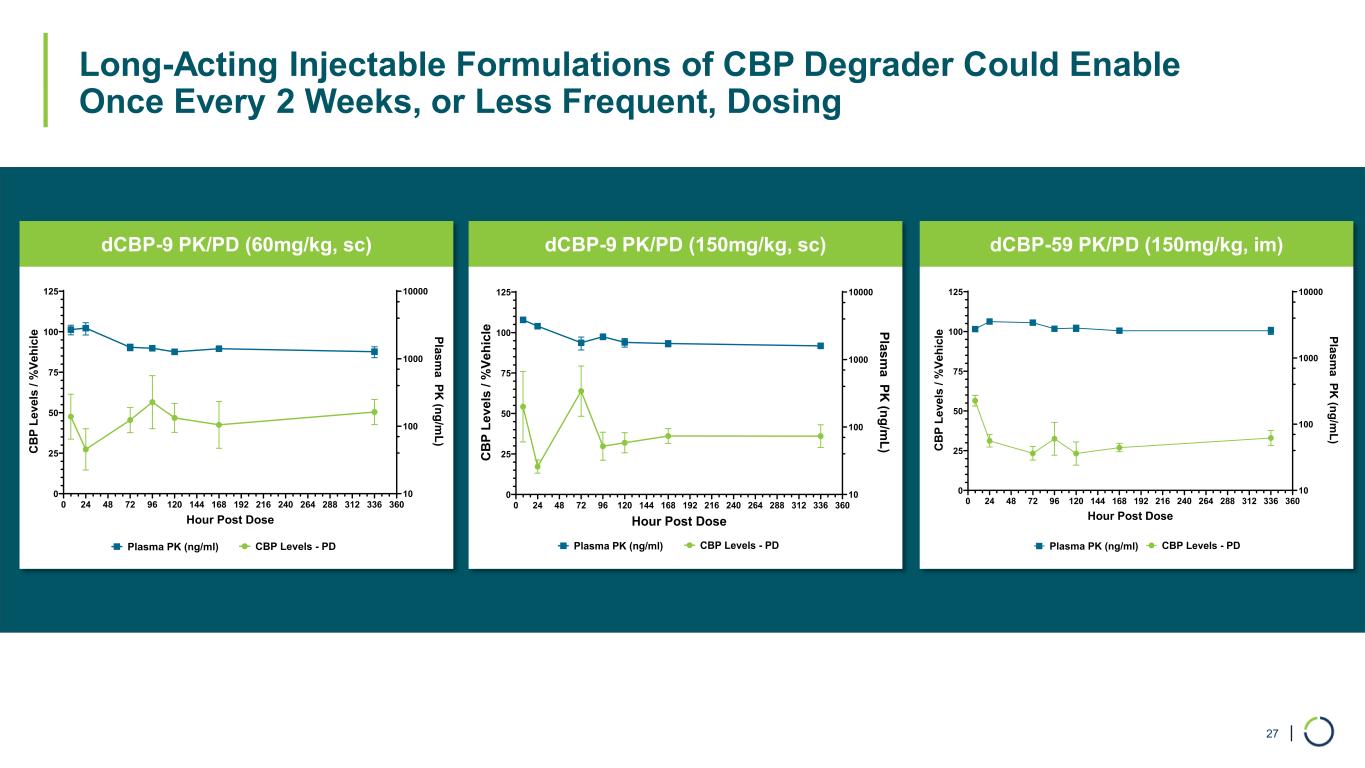 | Long-Acting Injectable Formulations of CBP Degrader Could Enable Once Every 2 Weeks, or Less Frequent, Dosing 27 dCBP-9 PK/PD (60mg/kg, sc) dCBP-9 PK/PD (150mg/kg, sc) dCBP-59 PK/PD (150mg/kg, im) 0 24 48 72 96 120 144 168 192 216 240 264 288 312 336 360 0 25 50 75 100 125 10 100 1000 10000 Hour Post Dose C BP L ev el s / % Ve hi cl e Plasm a PK (ng/m L) CBP Levels - PDPlasma PK (ng/ml) 0 24 48 72 96 120 144 168 192 216 240 264 288 312 336 360 0 25 50 75 100 125 10 100 1000 10000 Hour Post Dose C B P Le ve ls / % Ve hi cl e Plasm a PK (ng/m L) CBP Levels - PDPlasma PK (ng/ml) 0 24 48 72 96 120 144 168 192 216 240 264 288 312 336 360 0 25 50 75 100 125 10 100 1000 10000 Hour Post Dose C B P Le ve ls / % Ve hi cl e Plasm a PK (ng/m L) CBP Levels - PDPlasma PK (ng/ml)