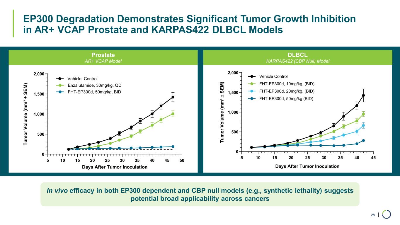 | EP300 Degradation Demonstrates Significant Tumor Growth Inhibition in AR+ VCAP Prostate and KARPAS422 DLBCL Models 28 Prostate AR+ VCAP Model 5 10 15 20 25 30 35 40 45 50 0 500 1,000 1,500 2,000 Days After Tumor Inoculation Tu m or V ol um e (m m ³+ S EM ) Vehicle Control Enzalutamide, 30mg/kg, QD FHT-EP300d, 50mg/kg, BID 5 10 15 20 25 30 35 40 45 0 500 1,000 1,500 2,000 Days After Tumor Inoculation Tu m or V ol um e (m m ³+ S EM ) Vehicle Control FHT-EP300d, 50mg/kg (BID) FHT-EP300d, 20mg/kg, (BID) FHT-EP300d, 10mg/kg, (BID) In vivo efficacy in both EP300 dependent and CBP null models (e.g., synthetic lethality) suggests potential broad applicability across cancers DLBCL KARPAS422 (CBP Null) Model