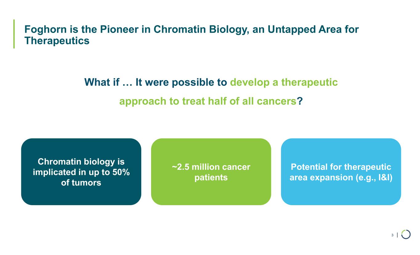 | Foghorn is the Pioneer in Chromatin Biology, an Untapped Area for Therapeutics 3 What if … It were possible to develop a therapeutic approach to treat half of all cancers? Chromatin biology is implicated in up to 50% of tumors ~2.5 million cancer patients Potential for therapeutic area expansion (e.g., I&I)