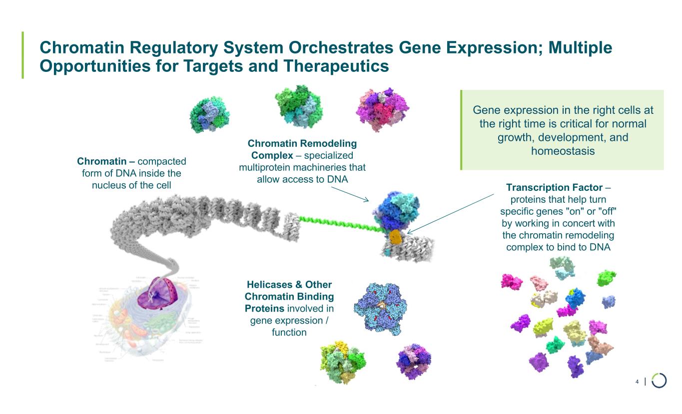 | Chromatin Regulatory System Orchestrates Gene Expression; Multiple Opportunities for Targets and Therapeutics 4 Chromatin – compacted form of DNA inside the nucleus of the cell Chromatin Remodeling Complex – specialized multiprotein machineries that allow access to DNA Transcription Factor – proteins that help turn specific genes "on" or "off" by working in concert with the chromatin remodeling complex to bind to DNA Helicases & Other Chromatin Binding Proteins involved in gene expression / function Gene expression in the right cells at the right time is critical for normal growth, development, and homeostasis