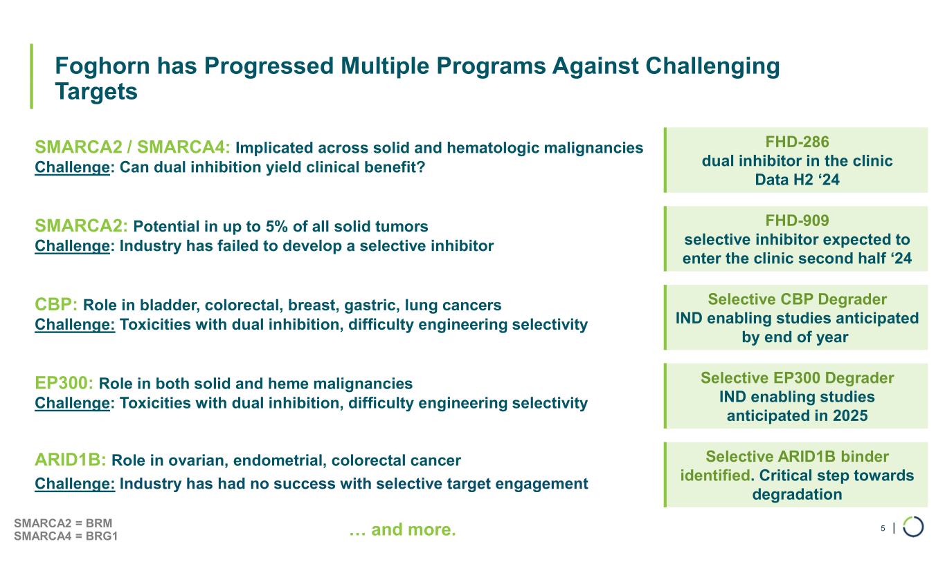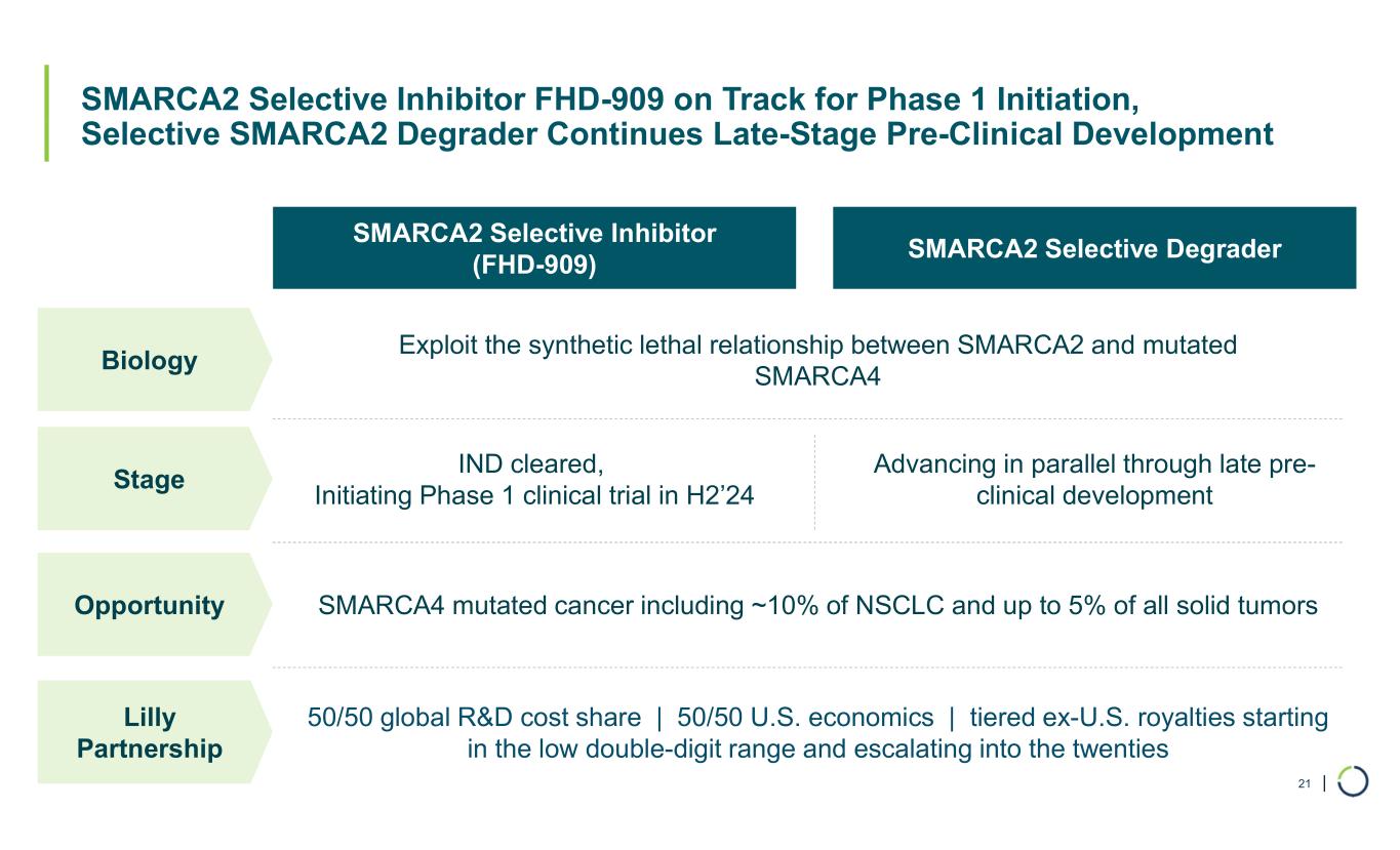 Clinical & Pre-Clinical Programs • FHD-286 – Dual SMARCA2 / SMARCA4 Inhibitor • FHD-909 (LY4050784) – Selective SMARCA2 Inhibitor • Selective CBP Degrader • Selective EP300 Degrader • Selective ARID1B Program