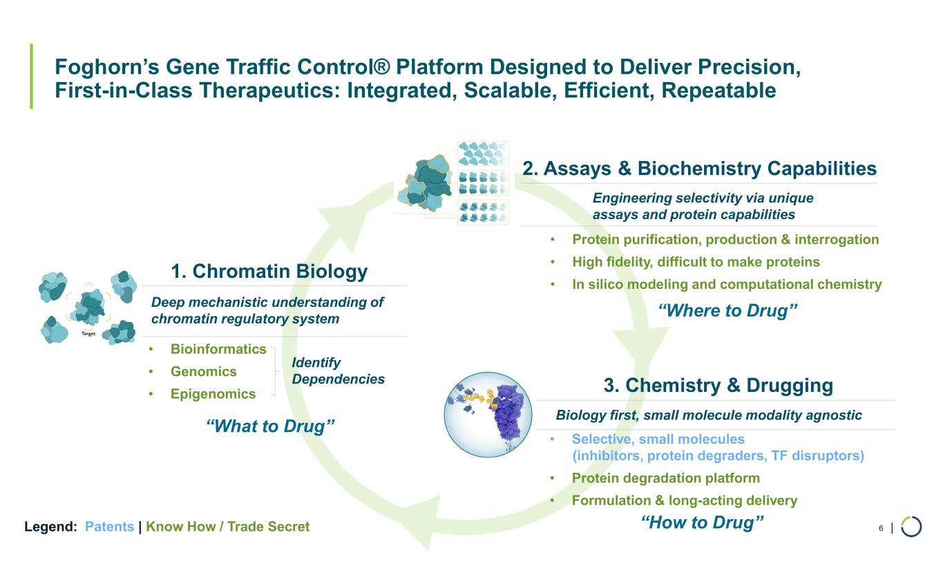 | Foghorn has Progressed Multiple Programs Against Challenging Targets 5 SMARCA2: Potential in up to 5% of all solid tumors Challenge: Industry has failed to develop a selective inhibitor EP300: Role in both solid and heme malignancies Challenge: Toxicities with dual inhibition, difficulty engineering selectivity ARID1B: Role in ovarian, endometrial, colorectal cancer Challenge: Industry has had no success with selective target engagement SMARCA2 / SMARCA4: Implicated across solid and hematologic malignancies Challenge: Can dual inhibition yield clinical benefit? Selective EP300 Degrader IND enabling studies anticipated in 2025 FHD-909 selective inhibitor expected to enter the clinic second half ‘24 CBP: Role in bladder, colorectal, breast, gastric, lung cancers Challenge: Toxicities with dual inhibition, difficulty engineering selectivity Selective CBP Degrader IND enabling studies anticipated by end of year FHD-286 dual inhibitor in the clinic Data H2 ‘24 Selective ARID1B binder identified. Critical step towards degradation … and more.SMARCA2 = BRM SMARCA4 = BRG1