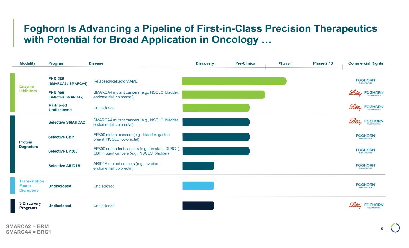 | The Next Foghorn Chapter: Delivering Multiple Potential Blockbusters into the Clinic 8 Pioneering BAF and Chromatin Biology (2016 – 2020)  Built platform and developed deep understanding of biology  Producing BAF and transcription factors at scale  Demonstrated druggability of chromatin regulatory system  Lilly strategic collaboration  FHD-286 demonstrated mutation-agnostic differentiation effect in acute myeloid leukemia (AML)  Initiated efforts on CBP and EP300  Expansion of protein degrader platform • Proof of concept data for SMARCA2 Selective Inhibition (FHD-909) in NSCLC* • Registrational trials for FHD-286 in AML • Potential for 5 additional INDs • Pipeline, platform, disease area expansion Differentiation POC, Platform & Pipeline Expansion (2021 – 2023) Progress Multiple High Value Assets into the Clinic (2024 – 2027) *Non-small cell lung cancer (NSCLC)