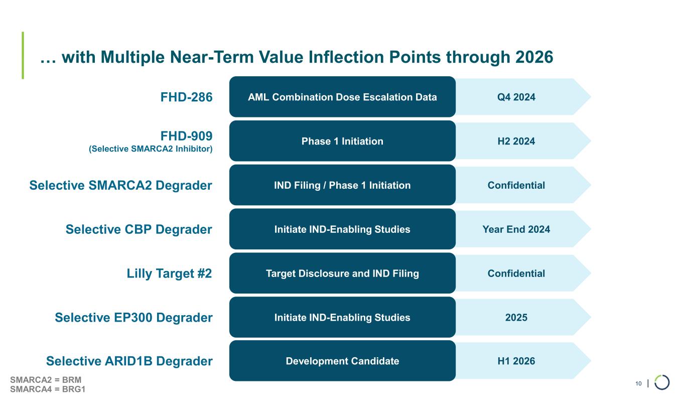 | … with Multiple Near-Term Value Inflection Points through 2026 10 Q4 2024AML Combination Dose Escalation Data FHD-286 H2 2024Phase 1 InitiationFHD-909 (Selective SMARCA2 Inhibitor) ConfidentialIND Filing / Phase 1 InitiationSelective SMARCA2 Degrader Year End 2024Initiate IND-Enabling StudiesSelective CBP Degrader 2025Initiate IND-Enabling StudiesSelective EP300 Degrader ConfidentialTarget Disclosure and IND FilingLilly Target #2 H1 2026Development CandidateSelective ARID1B Degrader SMARCA2 = BRM SMARCA4 = BRG1