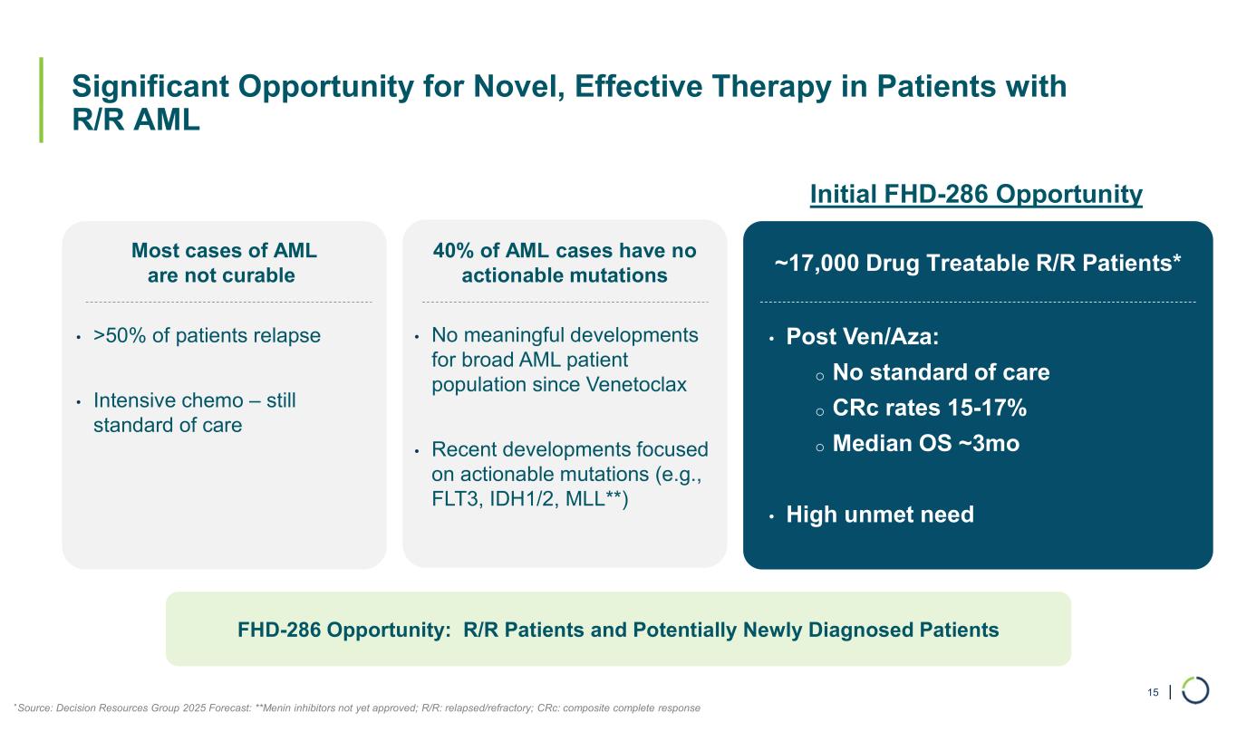 | Exploring BAF Dependency in Cancer with FHD-286 – Potent, First-in-Class, Oral Dual Inhibitor of SMARCA2 and SMARCA4 14 Clinical and pre-clinical data demonstrated broad- based differentiation across AML and multiple solid tumors BAF ATPase: SMARCA2 / SMARCA4 FHD-286: • Allosteric modulation inhibiting the activity of both SMARCA2 and SMARCA4 • Oral, daily, potent, first-in-class, small molecule inhibitor FHD-286 Differentiation Pre-clinical data support ability to overcome drug resistance (i.e., EGFR NSCLC, enzalutamide- resistant CRPC, PD-1 refractory) Overcoming Drug Resistance Clinical data demonstrated an increase of CD8+ T-cells and a reduction of T-regulatory cells Immune Modulation Current and Potential Future Opportunity Pre-clinical data support ability to address BAF mutationsMutations
