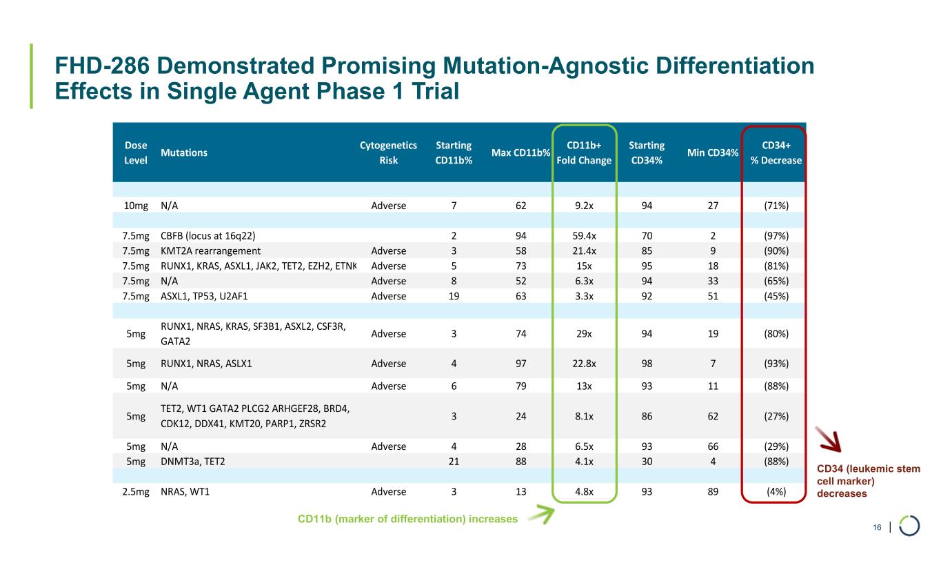 | FHD-286 Demonstrated Promising Mutation-Agnostic Differentiation Effects in Single Agent Phase 1 Trial 16 Dose Level Mutations Cytogenetics Risk Starting CD11b% Max CD11b% CD11b+ Fold Change Starting CD34% Min CD34% CD34+ % Decrease 10mg N/A Adverse 7 62 9.2x 94 27 (71%) 7.5mg CBFB (locus at 16q22) 2 94 59.4x 70 2 (97%) 7.5mg KMT2A rearrangement Adverse 3 58 21.4x 85 9 (90%) 7.5mg RUNX1, KRAS, ASXL1, JAK2, TET2, EZH2, ETNK1 Adverse 5 73 15x 95 18 (81%) 7.5mg N/A Adverse 8 52 6.3x 94 33 (65%) 7.5mg ASXL1, TP53, U2AF1 Adverse 19 63 3.3x 92 51 (45%) 5mg RUNX1, NRAS, KRAS, SF3B1, ASXL2, CSF3R, GATA2 Adverse 3 74 29x 94 19 (80%) 5mg RUNX1, NRAS, ASLX1 Adverse 4 97 22.8x 98 7 (93%) 5mg N/A Adverse 6 79 13x 93 11 (88%) 5mg TET2, WT1 GATA2 PLCG2 ARHGEF28, BRD4, CDK12, DDX41, KMT20, PARP1, ZRSR2 3 24 8.1x 86 62 (27%) 5mg N/A Adverse 4 28 6.5x 93 66 (29%) 5mg DNMT3a, TET2 21 88 4.1x 30 4 (88%) 2.5mg NRAS, WT1 Adverse 3 13 4.8x 93 89 (4%) CD11b (marker of differentiation) increases CD34 (leukemic stem cell marker) decreases