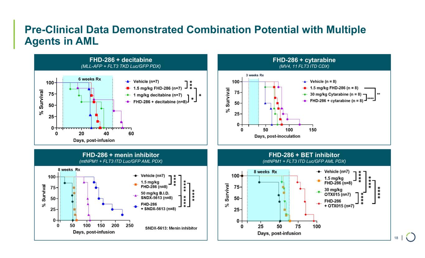 | FHD-286 + decitabine (MLL-AFP + FLT3 TKD Luc/GFP PDX) Pre-Clinical Data Demonstrated Combination Potential with Multiple Agents in AML 18 FHD-286 + BET inhibitor (mtNPM1 + FLT3 ITD Luc/GFP AML PDX) FHD-286 + menin inhibitor (mtNPM1 + FLT3 ITD Luc/GFP AML PDX) FHD-286 + cytarabine (MV4, 11 FLT3 ITD CDX) SNDX-5613: Menin inhibitor ✱ ✱ ✱ ✱ ✱